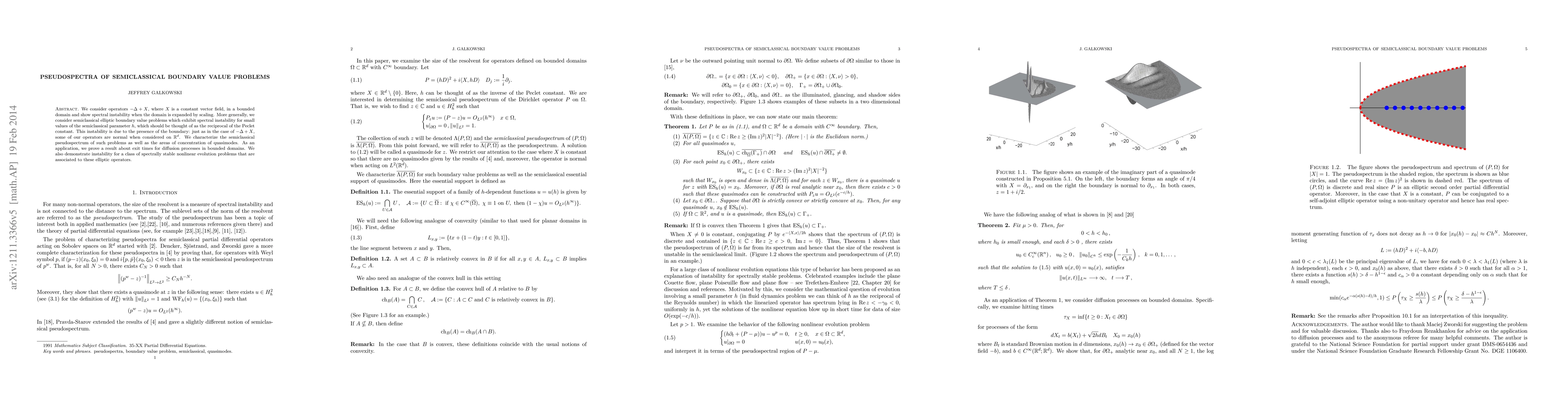 We consider operators $-\Delta + X$ where $X$ is a constant vector field, in a bounded domain and show spectral instability when the domain is expanded by scaling. More generally, we consider semiclassical elliptic boundary value problems which exhibit spectral instability for small values of the semiclassical parameter h, which should be thought of as the reciprocal of the Peclet constant. This instability is due to the presence of the boundary: just as in the case of $-\Delta + X$, some of our operators are normal when considered on R^d. We characterize the semiclassical pseudospectrum of such problems as well as the areas of concentration of quasimodes. As an application, we prove a result about exit times for diffusion processes in bounded domains. We also demonstrate instability for a class of spectrally stable nonlinear evolution problems that are associated to these elliptic operators.