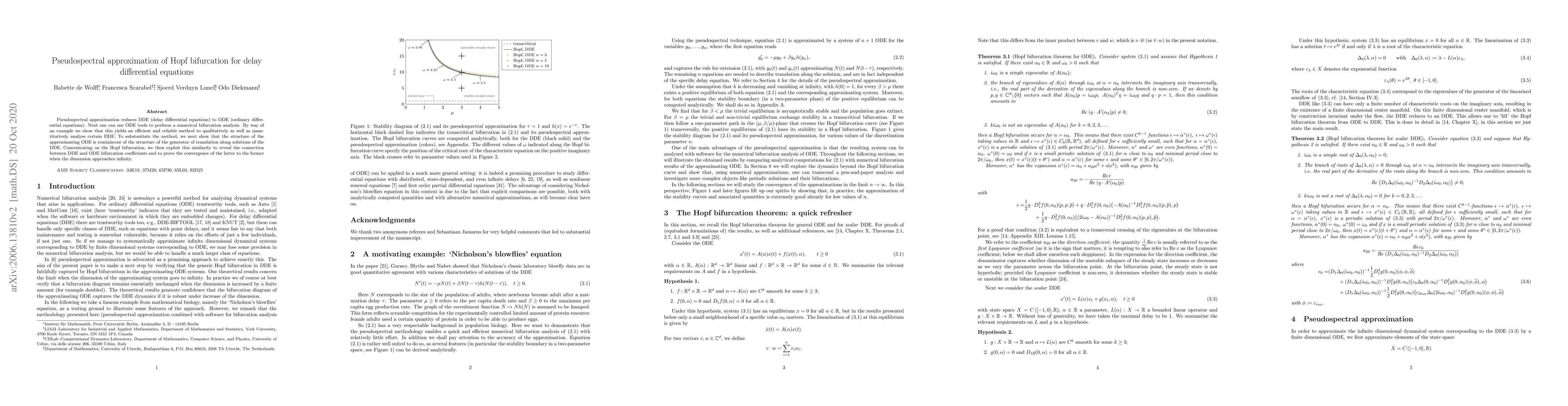 Pseudospectral approximation reduces DDE (delay differential equations) to ODE (ordinary differential equations). Next one can use ODE tools to perform a numerical bifurcation analysis. By way of an example we show that this yields an efficient and reliable method to qualitatively as well as quantitatively analyse certain DDE. To substantiate the method, we next show that the structure of the approximating ODE is reminiscent of the structure of the generator of translation along solutions of the DDE. Concentrating on the Hopf bifurcation, we then exploit this similarity to reveal the connection between DDE and ODE bifurcation coefficients and to prove the convergence of the latter to the former when the dimension approaches infinity.