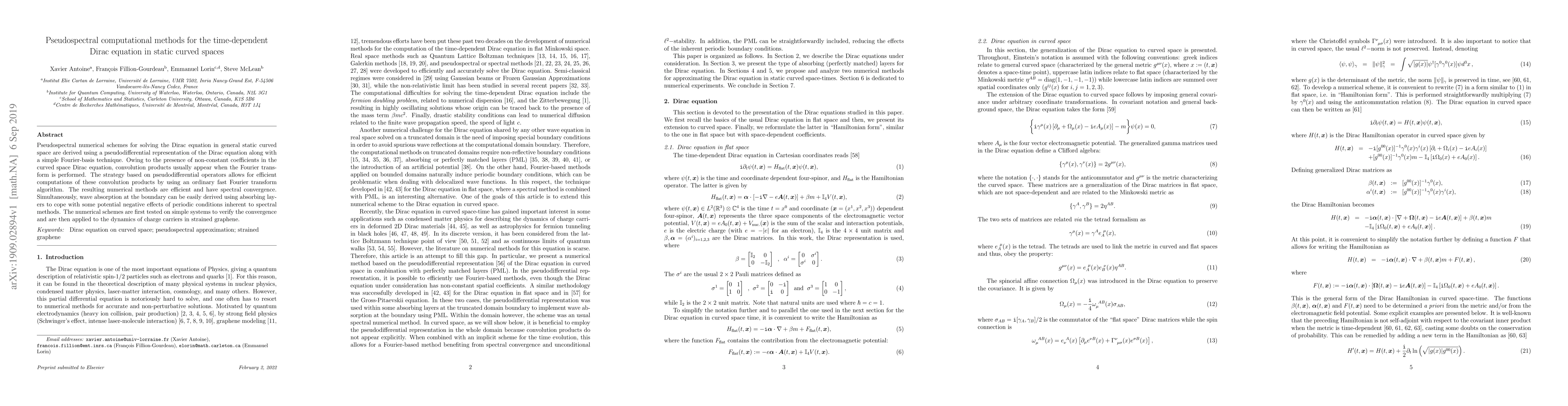 This paper develops pseudospectral computational methods for solving the time-dependent Dirac equation in static curved spaces using a pseudodifferential representation and Fourier-basis techniques. The proposed method efficiently handles convolution products and achieves spectral convergence, with additional absorbing layers to mitigate periodic boundary effects.