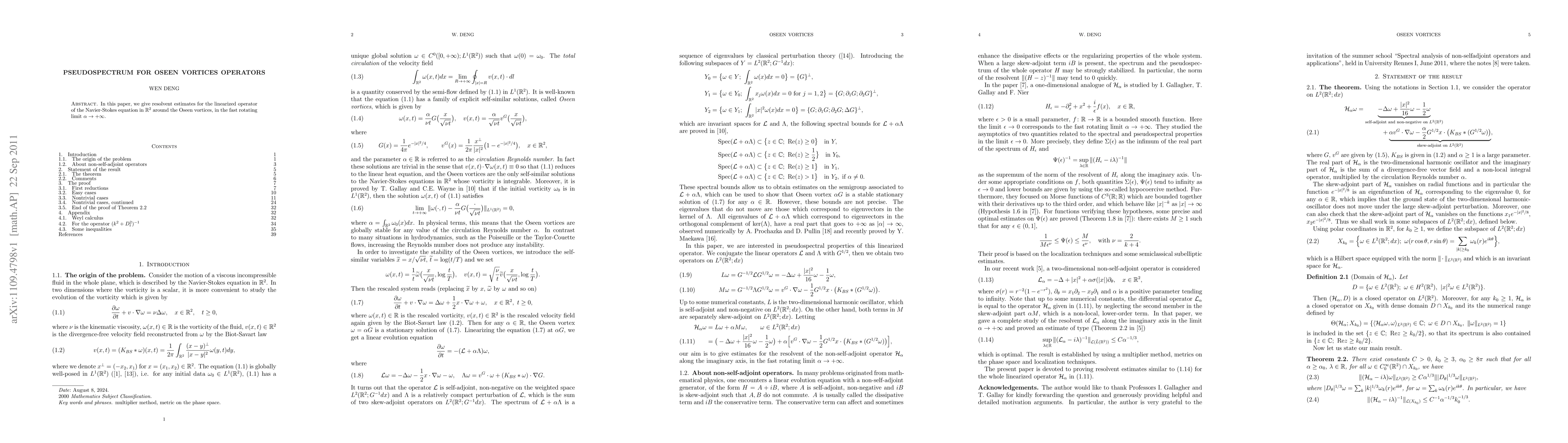 In this paper, we give resolvent estimates for the linearized operator of the Navier-Stokes equation in $\R^2$ around the Oseen vortices, in the fast rotating limit $\alpha\to+\infty$.