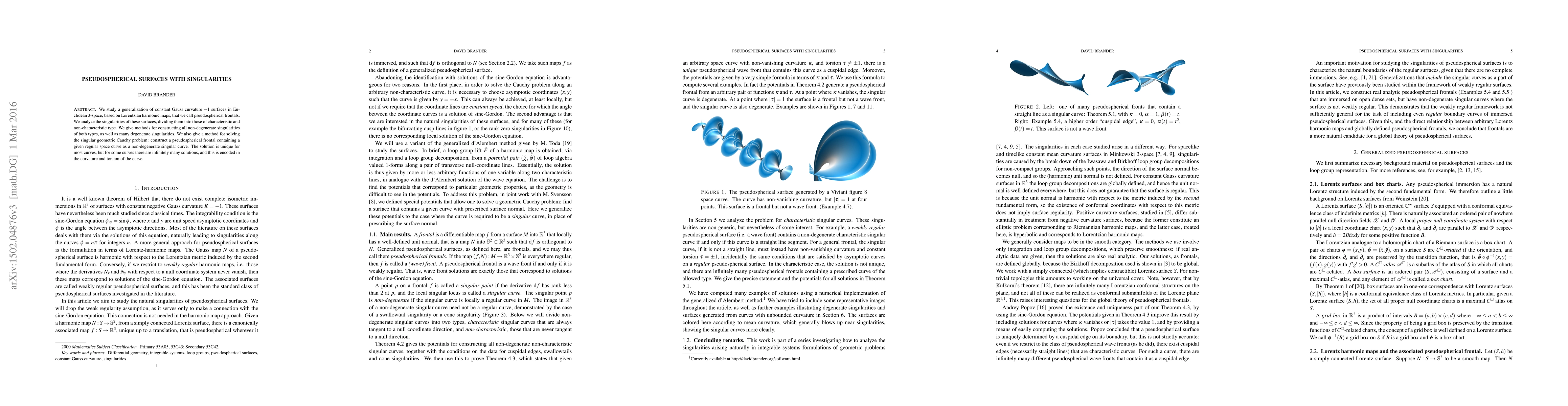 We study a generalization of constant Gauss curvature -1 surfaces in Euclidean 3-space, based on Lorentzian harmonic maps, that we call pseudospherical frontals. We analyze the singularities of these surfaces, dividing them into those of characteristic and non-characteristic type. We give methods for constructing all non-degenerate singularities of both types, as well as many degenerate singularities. We also give a method for solving the singular geometric Cauchy problem: construct a pseudospherical frontal containing a given regular space curve as a non-degenerate singular curve. The solution is unique for most curves, but for some curves there are infinitely many solutions, and this is encoded in the curvature and torsion of the curve.