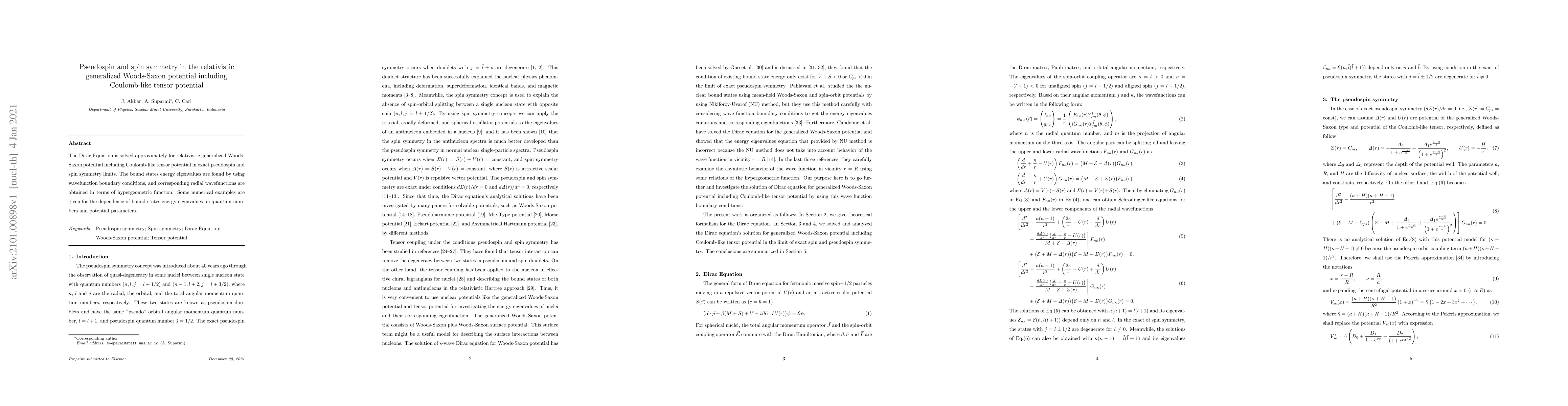 This paper solves the Dirac Equation for relativistic generalized Woods-Saxon potential with a Coulomb-like tensor potential, finding energy eigenvalues in pseudospin and spin symmetry limits using hypergeometric functions. Numerical examples illustrate the dependence of bound states on quantum numbers and potential parameters.