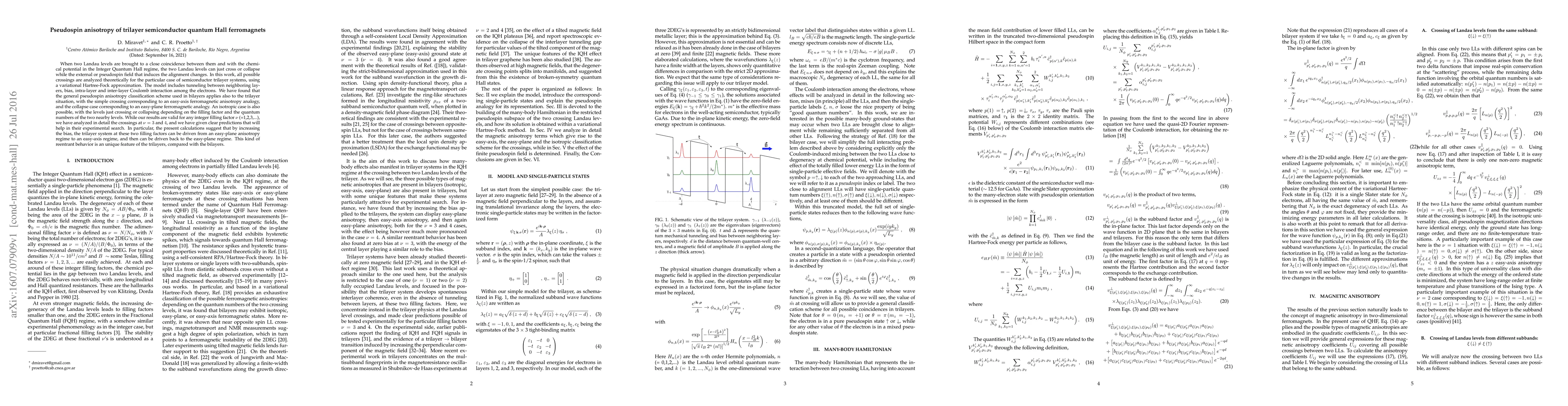 When two Landau levels are brought to a close coincidence between them and with the chemical potential in the Integer Quantum Hall regime, the two Landau levels can just cross or collapse while the external or pseudospin field that induces the alignment changes. In this work, all possible crossings are analyzed theoretically for the particular case of semiconductor trilayer systems, using a variational Hartree-Fock approximation. The model includes tunneling between neighboring layers, bias, intra-layer and inter-layer Coulomb interaction among the electrons. We have found that the general pseudospin anisotropy classification scheme used in bilayers applies also to the trilayer situation, with the simple crossing corresponding to an easy-axis ferromagnetic anisotropy analogy, and the collapse case corresponding to an easy-plane ferromagnetic analogy. An isotropic case is also possible, with the levels just crossing or collapsing depending on the filling factor and the quantum numbers of the two nearby levels. While our results are valid for any integer filling factor $\nu$ (=1,2,3,...), we have analyzed in detail the crossings at $\nu=3$ and $4$, and we have given clear predictions that will help in their experimental search. In particular, the present calculations suggest that by increasing the bias, the trilayer system at these two filling factors can be driven from an easy-plane anisotropy regime to an easy-axis regime, and then can be driven back to the easy-plane regime. This kind of reentrant behavior is an unique feature of the trilayers, compared with the bilayers.