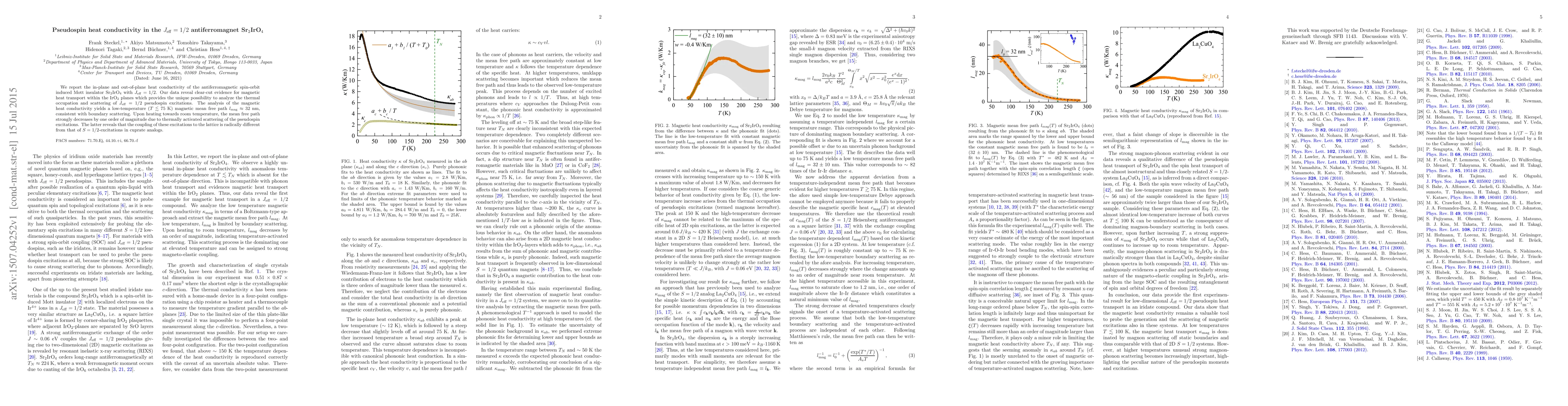 This paper investigates the heat conductivity in the $J_\mathrm{eff} = 1/2$ antiferromagnetic Mott insulator Sr$_2$IrO$_4$, revealing distinct magnetic heat transport within the IrO$_2$ planes. The study finds a significant decrease in magnetic mean free path with temperature, indicating different lattice coupling for pseudospin excitations compared to $S = 1/2$-excitations in cuprates.