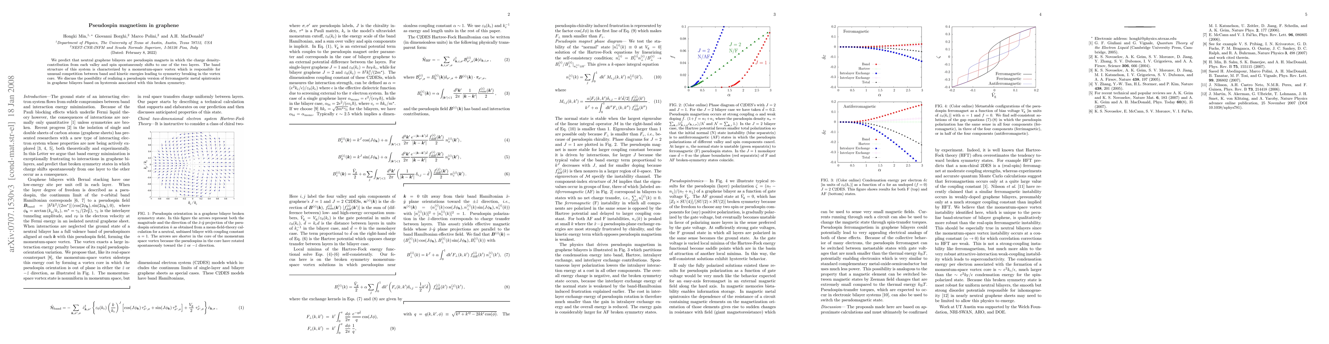 We predict that neutral graphene bilayers are pseudospin magnets in which the charge density-contribution from each valley and spin spontaneously shifts to one of the two layers. The band structure of this system is characterized by a momentum-space vortex which is responsible for unusual competition between band and kinetic energies leading to symmetry breaking in the vortex core. We discuss the possibility of realizing a pseudospin version of ferromagnetic metal spintronics in graphene bilayers based on hysteresis associated with this broken symmetry.