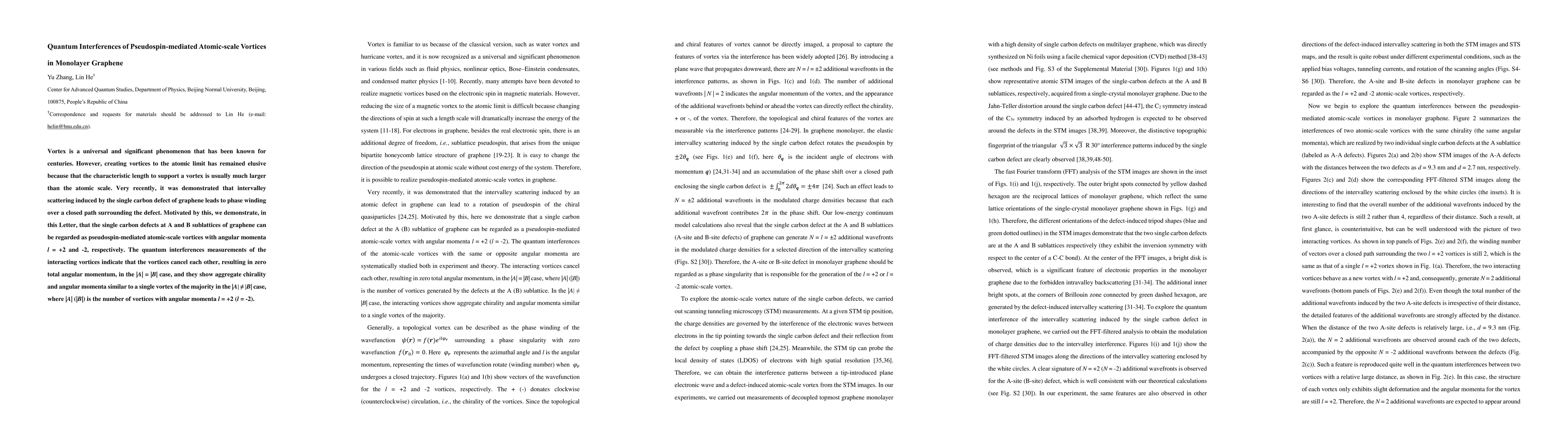 This paper demonstrates the creation of pseudospin-mediated atomic-scale vortices in monolayer graphene via single carbon defects, showing quantum interferences that result in zero total angular momentum when the number of vortices is equal. When unequal, the vortices exhibit aggregate chirality and angular momenta akin to a single dominant vortex.