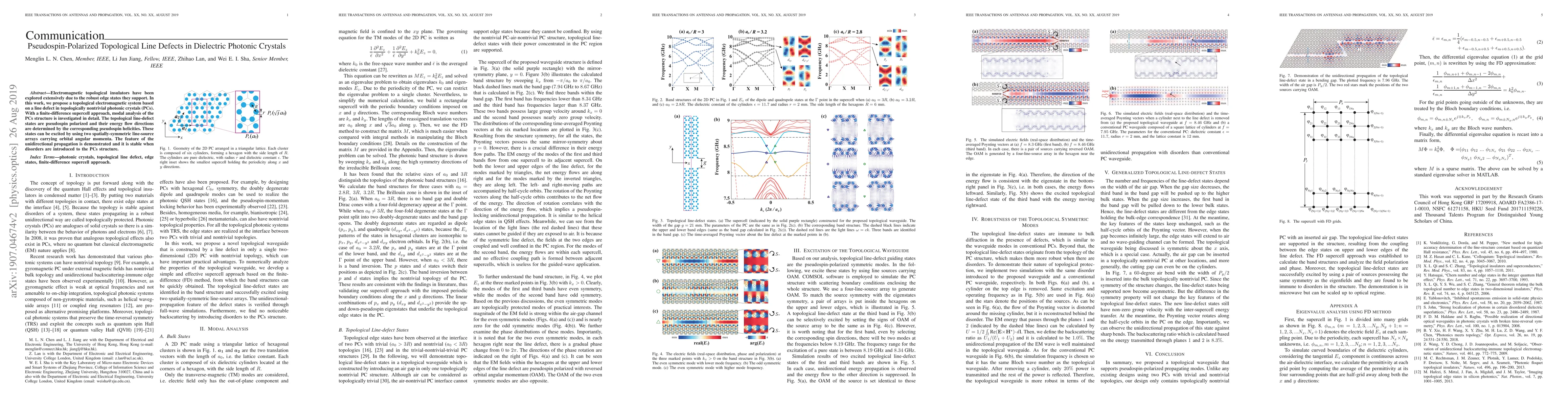 This paper proposes a topological electromagnetic system in dielectric photonic crystals featuring pseudospin-polarized topological line defects. The study demonstrates unidirectional propagation of topological states, which remain stable even with structural disorders.