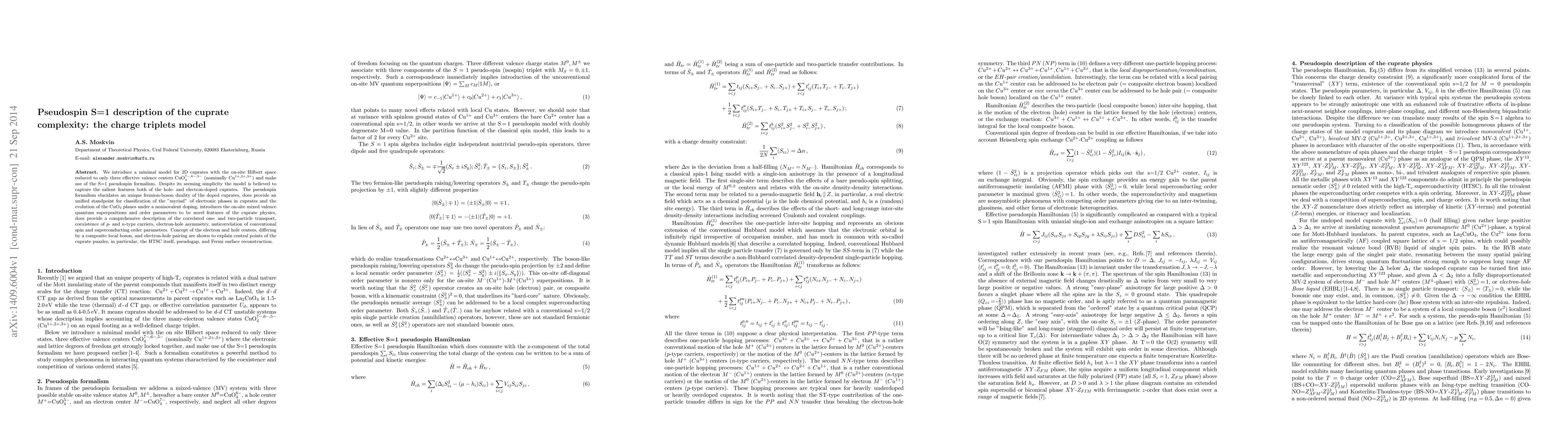 This paper proposes a simplified S=1 pseudospin model for 2D cuprates, focusing on three effective valence states of copper ions. The model uses pseudospin formalism to describe complex electronic phases, including the high-temperature superconductivity, pseudogap, and Fermi surface changes in cuprates.