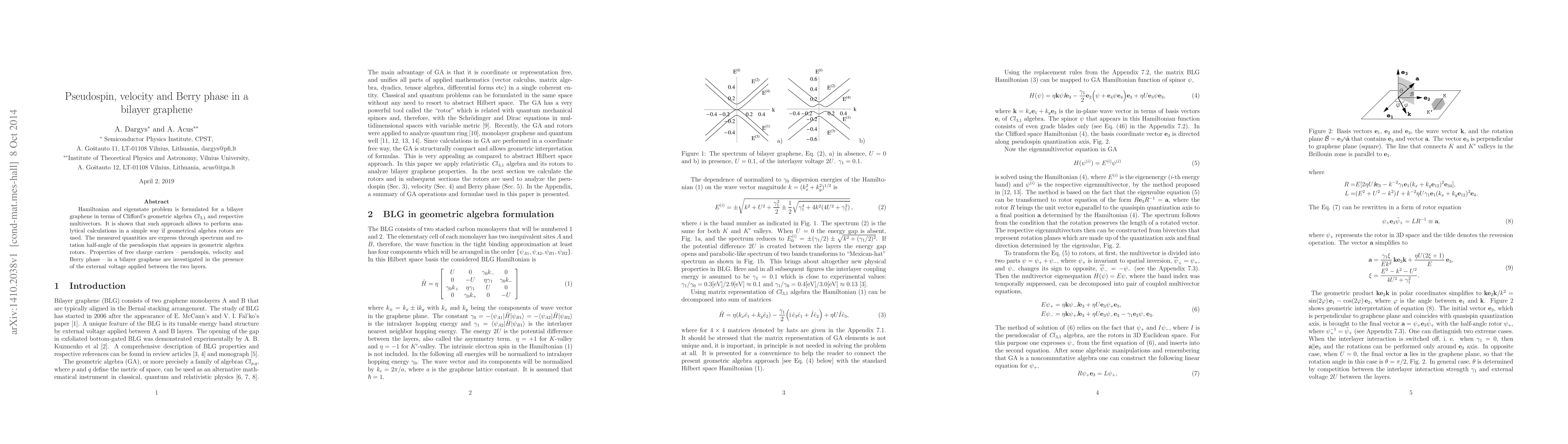 This research formulates the Hamiltonian for bilayer graphene using Clifford's geometric algebra, allowing for simple analytical calculations. It investigates the effects of an external voltage on the pseudospin, velocity, and Berry phase of charge carriers.