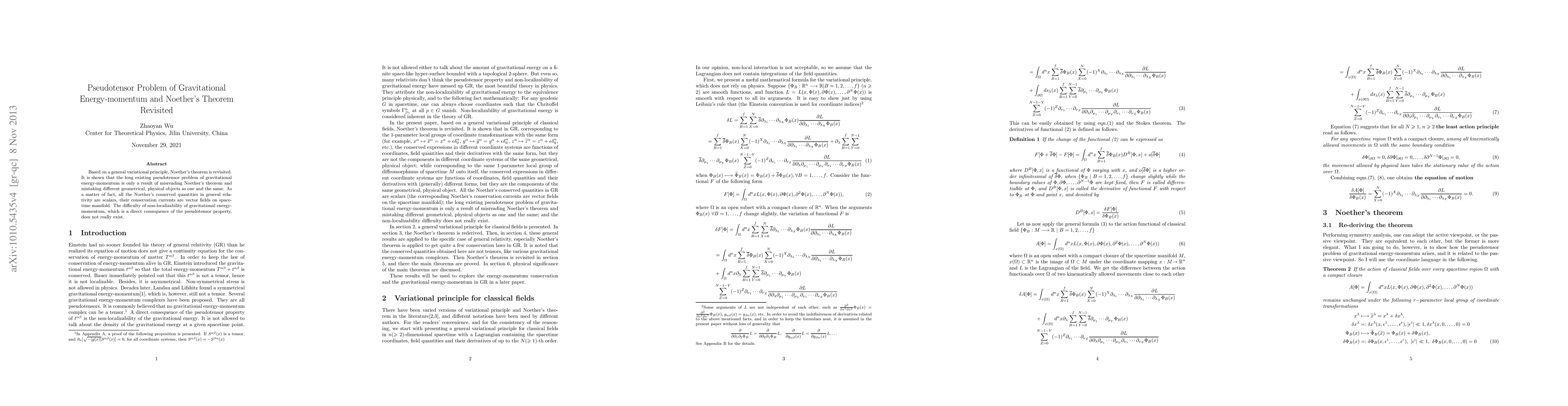 This paper revisits Noether's theorem within a general variational framework, demonstrating that the pseudotensor problem of gravitational energy-momentum arises from misinterpretations of the theorem, which actually yields scalar conserved quantities. It also disproves the notion that the non-localizability of gravitational energy-momentum is due to the equivalence principle.