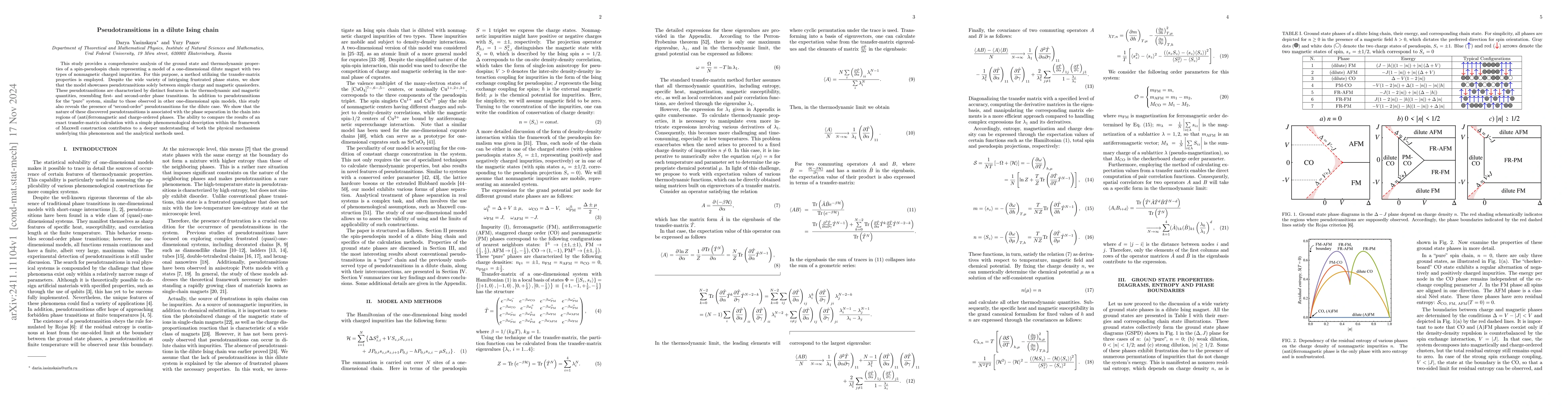 This paper investigates a dilute Ising chain with impurities, employing transfer-matrix methods to analyze pseudotransitions between charge and magnetic quasiorders, showing resemblance to first- and second-order phase transitions, and attributing these to phase separation in the chain. The study also compares exact calculations with phenomenological models for a deeper understanding.
