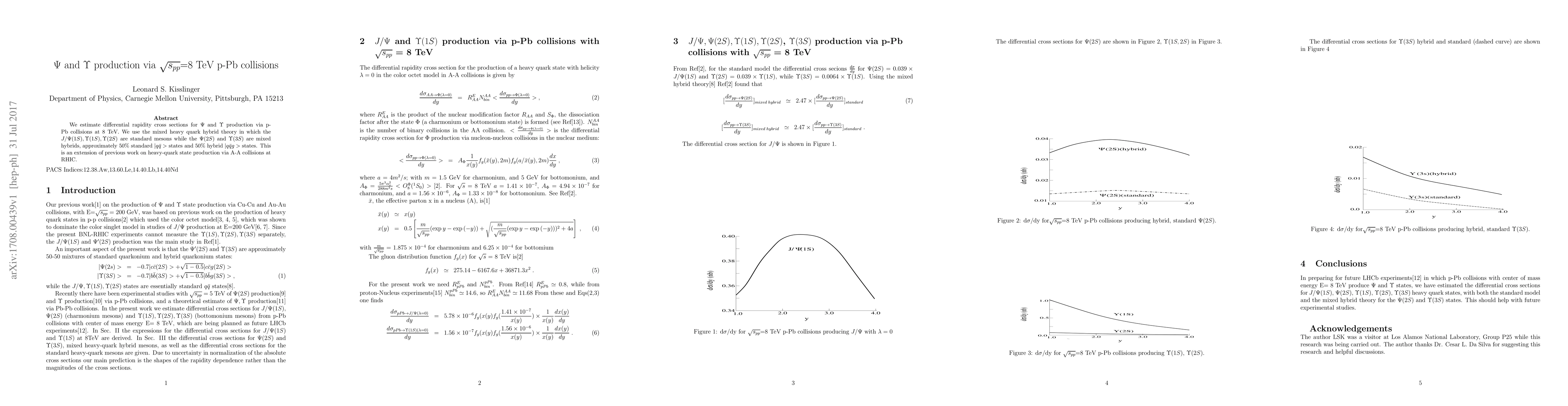 We estimate differential rapidity cross sections for $\Psi$ and $\Upsilon$ production via p-Pb collisions at 8 TeV. We use the mixed heavy quark hybrid theory in which the $J/\Psi(1S),\Upsilon(1S),\Upsilon(2S)$ are standard mesons while the $\Psi(2S)$ and $\Upsilon(3S)$ are mixed hybrids, approximately 50% standard $|q \bar{q}>$ states and 50% hybrid $|q \bar{q} g>$ states. This is an extension of previous work on heavy-quark state production via A-A collisions at RHIC.