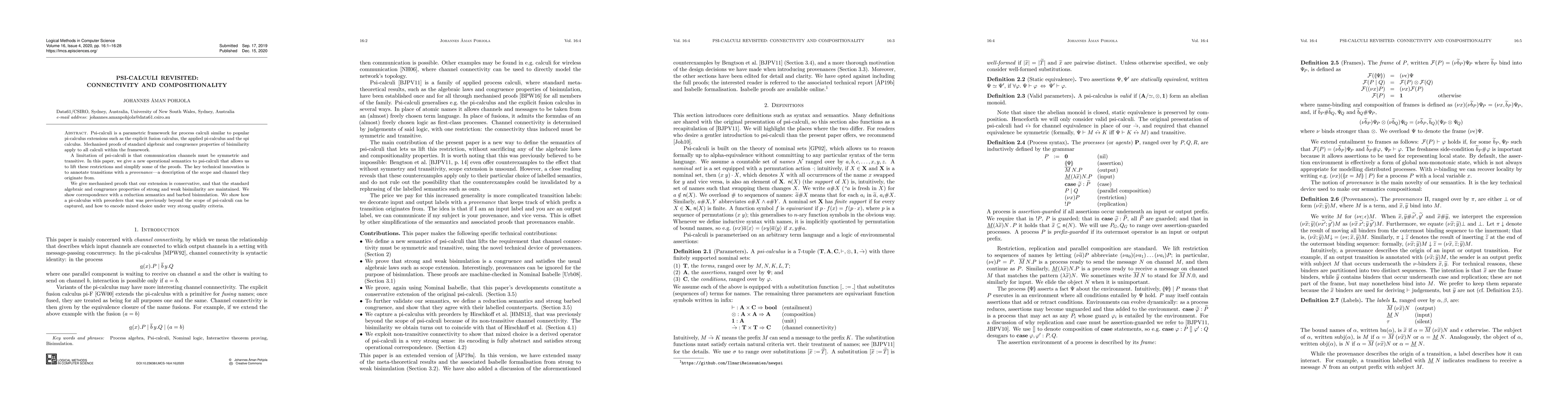 Psi-calculi is a parametric framework for process calculi similar to popular pi-calculus extensions such as the explicit fusion calculus, the applied pi-calculus and the spi calculus. Mechanised proofs of standard algebraic and congruence properties of bisimilarity apply to all calculi within the framework. A limitation of psi-calculi is that communication channels must be symmetric and transitive. In this paper, we give a new operational semantics to psi-calculi that allows us to lift these restrictions and simplify some of the proofs. The key technical innovation is to annotate transitions with a provenance -- a description of the scope and channel they originate from. We give mechanised proofs that our extension is conservative, and that the standard algebraic and congruence properties of strong and weak bisimilarity are maintained. We show correspondence with a reduction semantics and barbed bisimulation. We show how a pi-calculus with preorders that was previously beyond the scope of psi-calculi can be captured, and how to encode mixed choice under very strong quality criteria.