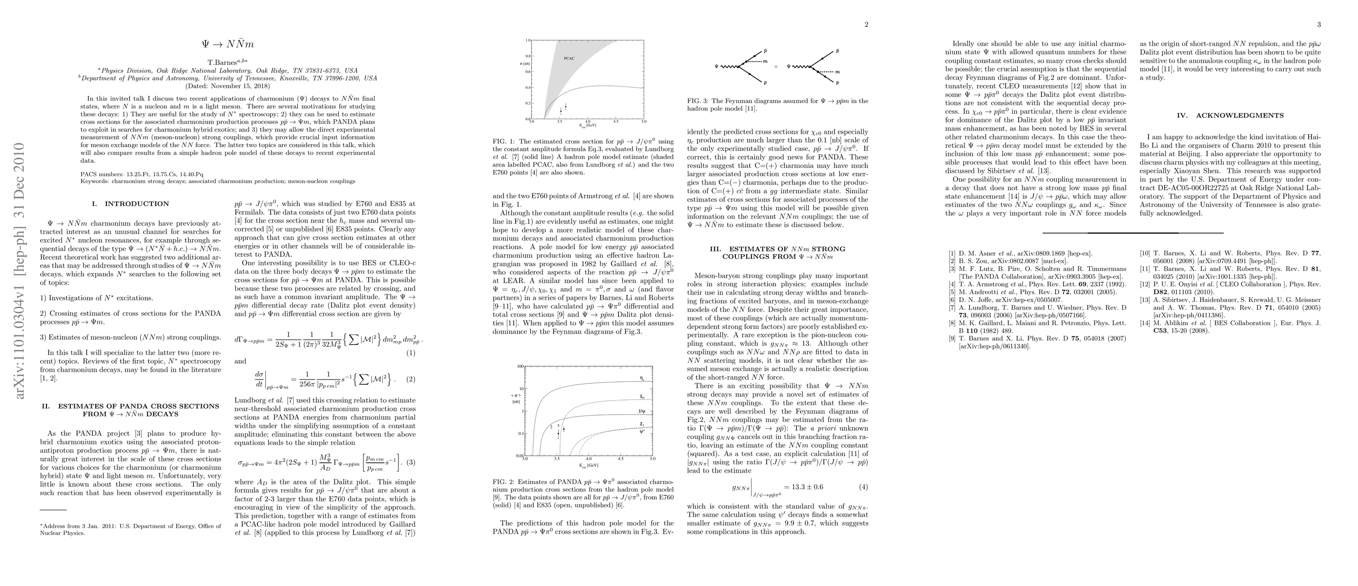 This paper discusses charmonium (Psi) decays to nucleon-meson final states, exploring their utility in N* spectroscopy and estimating cross sections for charmonium production processes. It also examines the potential for measuring NNm strong couplings, comparing model predictions with experimental data.