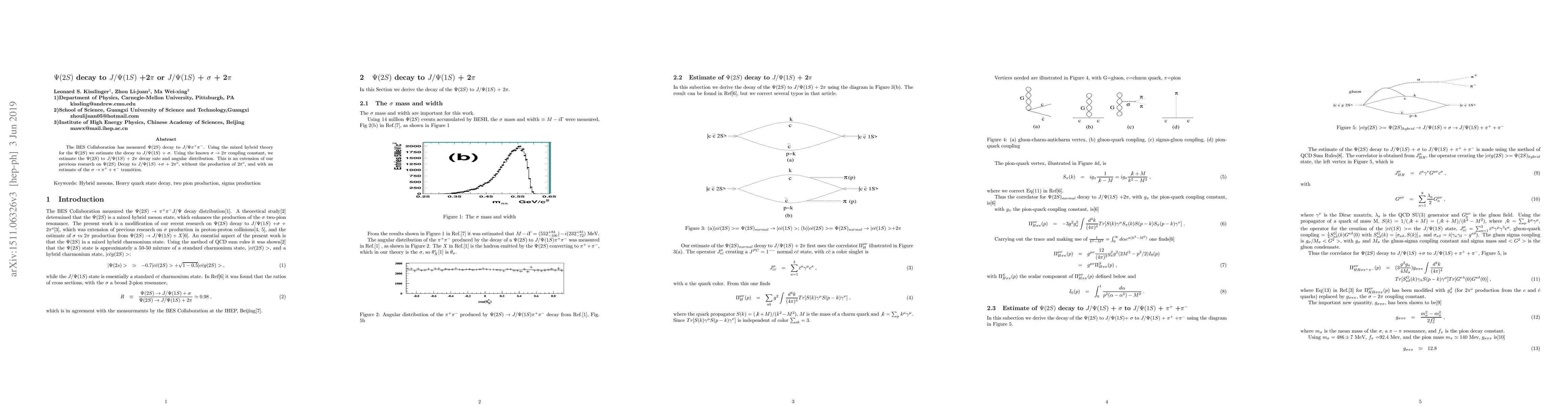 The BES Collaboration has measured $\Psi(2S)$ decay to $J/\Psi \pi^+\pi^-$. Using the mixed hybrid theory for the $\Psi(2S)$ we estimate the decay to $J/\Psi(1S)$ + $\sigma$. Using the known $\sigma \rightarrow 2\pi$ coupling constant, we estimate the $\Psi(2S)$ to $J/\Psi(1S)$ + $2\pi$ decay rate and angular distribution. This is an extension of our previous research on $\Psi(2S)$ Decay to $J/\Psi(1S)$ +$\sigma$ + 2$\pi^o$, without the production of 2$\pi^o$, and with an estimate of the $\sigma \rightarrow \pi^+ + \pi^-$ transition.