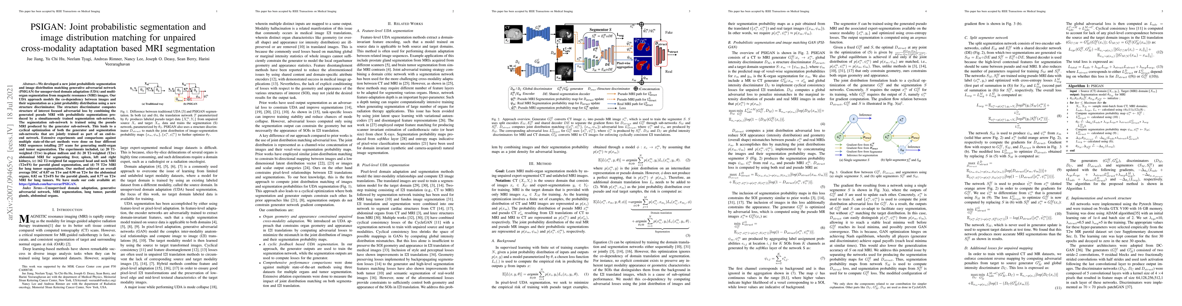 PSIGAN is a generative adversarial network designed for unsupervised domain adaptation in MRI segmentation, achieving high Dice scores across various organ types and MRI sequences. It jointly optimizes segmentation and distribution matching, outperforming state-of-the-art methods.