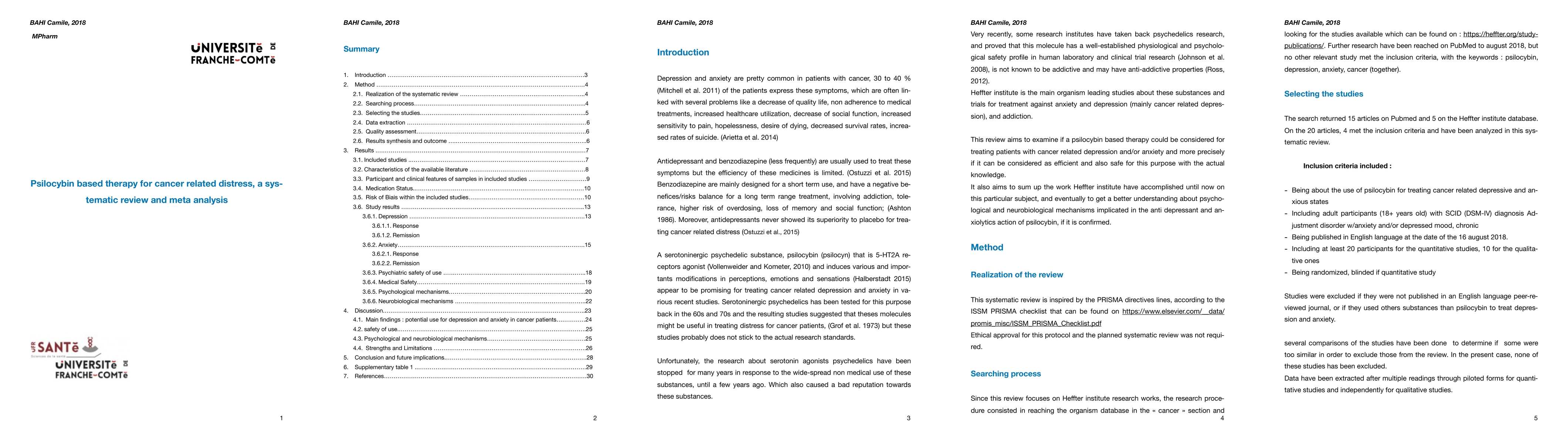 Background : depression and anxiety are common in patients with cancer, classical antidepressant has no proven efficacy on this type of distress compared to placebo. A Psilocybin (serotoninergic hallucinogen) based therapy appear to give promising results among recent studies. Aims : to examine if a Psilocybin based therapy could be considered for patients with cancer related depression and anxiety and to assume it's safety. To sum up Heffter institute work, as the main institute working on this topic. Method : following PRISMA (Preferred Reporting Items for Systematic reviews and Meta Analyses) guidelines, a systematic review was conducted, for quantitative and qualitative studies about psilocybin for treating cancer related depression and anxiety. Pubmed and the Heffter institute databases have been reached for this purpose, separating studies in types : qualitative or quantitative. We studied the effects on cancer related depression and anxiety separately and investigated the psychological and neurobiological mechanisms. Results : the four studies included a total of 105 randomized patients, meta analysis on depression and anxiety with pooled Peto odds ratio showed a significant superiority of Psilocybin over placebo. The substance appeared to be safe for this type of patients. Surprising psychological mechanisms hypothesis have been found out. Conclusion : psilocybin appear to be potentially useful as a treatment for cancer related depression and anxiety. Future research should verify these findings on wider population and eventually seek a way to apply therapy to non hospitalized (ambulatory) patients. Keywords : psilocybin, depression, anxiety, review, meta-analysis