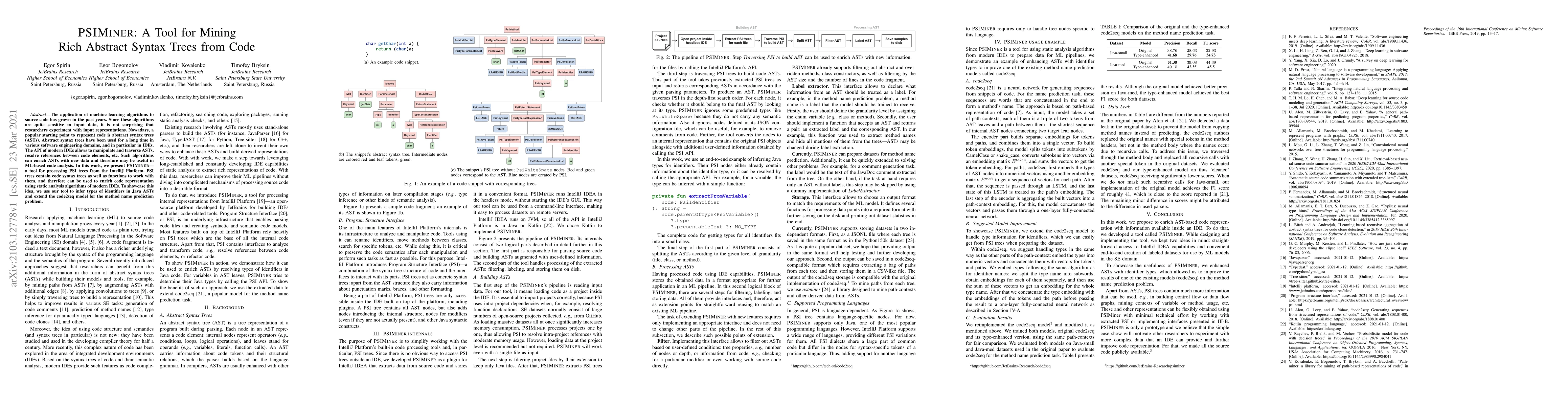 PSIMiner is a tool designed to process PSI trees from the IntelliJ Platform, enriching abstract syntax trees (ASTs) with additional data through static analysis algorithms. It demonstrates its utility by inferring types in Java ASTs and enhancing the code2seq model for method name prediction.