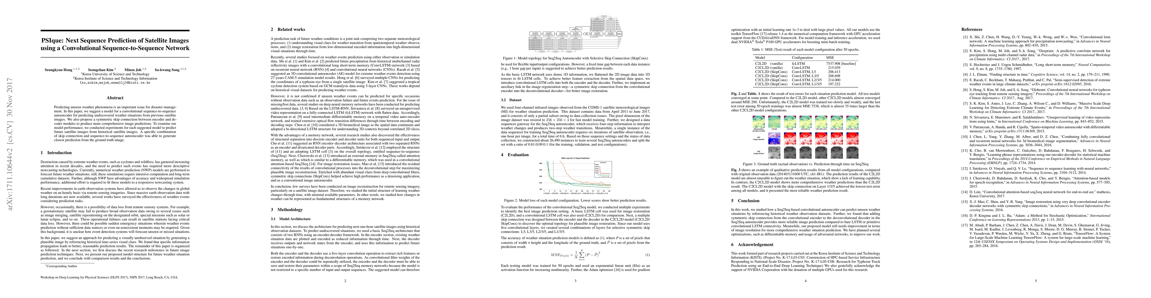 This paper proposes a convolutional sequence-to-sequence autoencoder with symmetric skip connections for predicting future satellite images to forecast unseen weather phenomena. Experimental results show that the model can generate accurate predictions by leveraging historical satellite images.