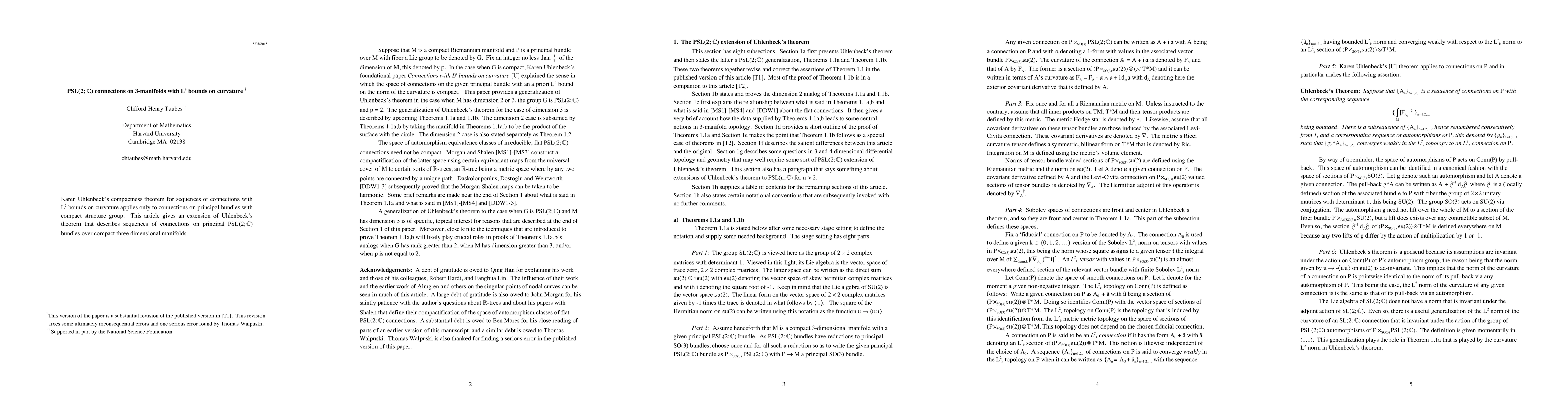 This paper extends Karen Uhlenbeck's compactness theorem for L2-bounded connections to principal PSL(2;C) bundles over compact 3-manifolds, providing a framework for analyzing such sequences of connections. The proof establishes the convergence properties of these connections under L2 curvature bounds.