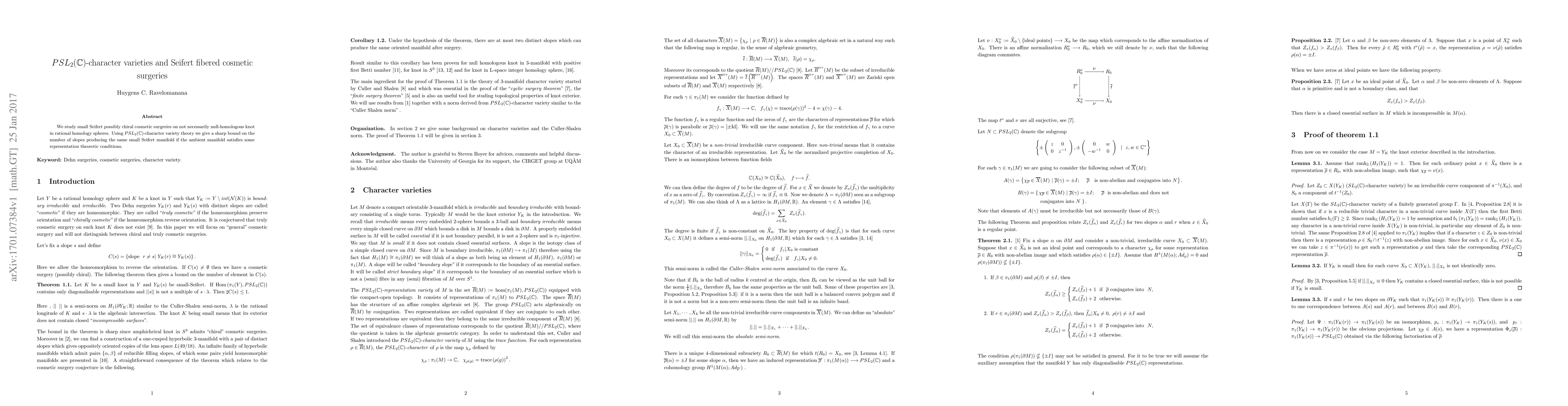 We study small Seifert possibly chiral cosmetic surgeries on not necessarily null-homologous knot in rational homology spheres. Using $PSL_2(\mathbb{C})$-character variety theory we give a sharp bound on the number of slopes producing the same small Seifert manifold if the ambient manifold satisfies some representation theoretic conditions.