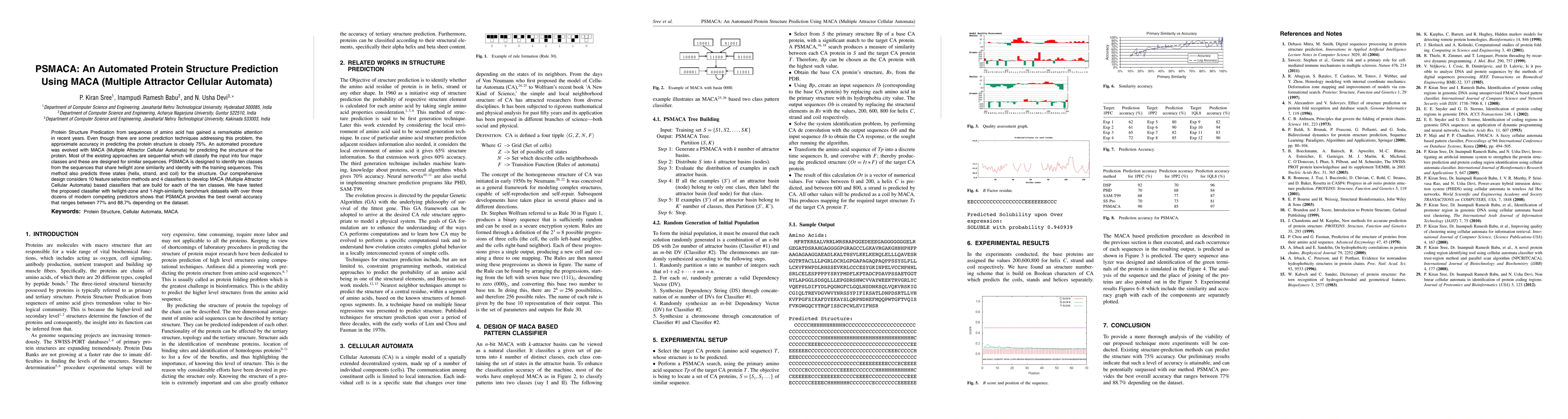 PSMACA employs Multiple Attractor Cellular Automata to automate protein structure prediction, identifying ten classes of amino acid sequences and predicting three structural states. The method outperforms existing predictors, achieving accuracy between 77% and 88.7% on benchmark datasets.