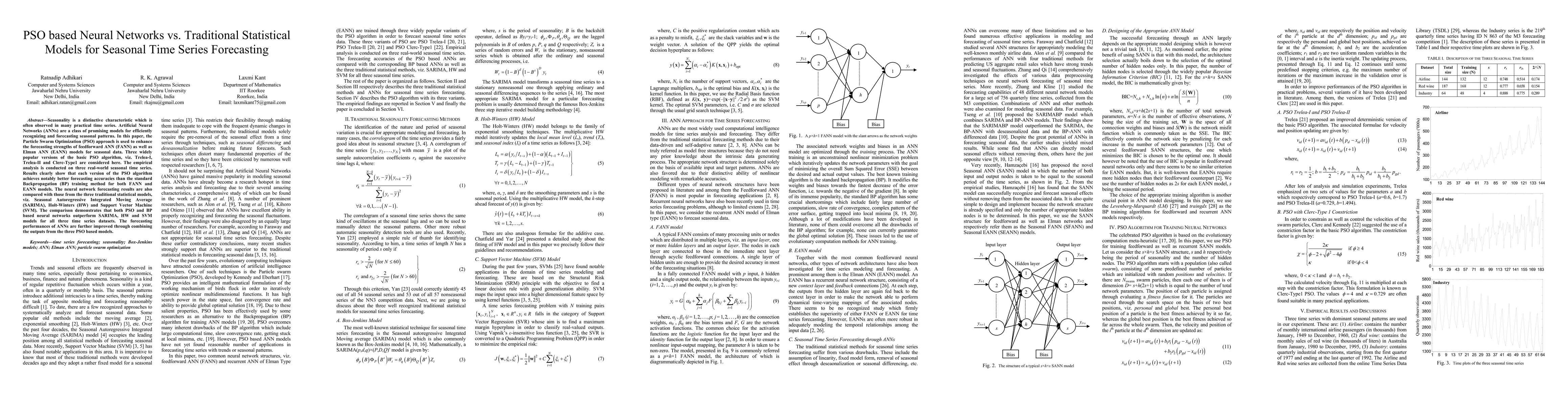This paper compares the performance of Particle Swarm Optimization (PSO) enhanced Artificial Neural Networks (ANNs) against traditional statistical models for seasonal time series forecasting. Results show that PSO-optimized ANNs outperform both standard Backpropagation trained ANNs and traditional models like SARIMA, Holt-Winters, and SVM.
