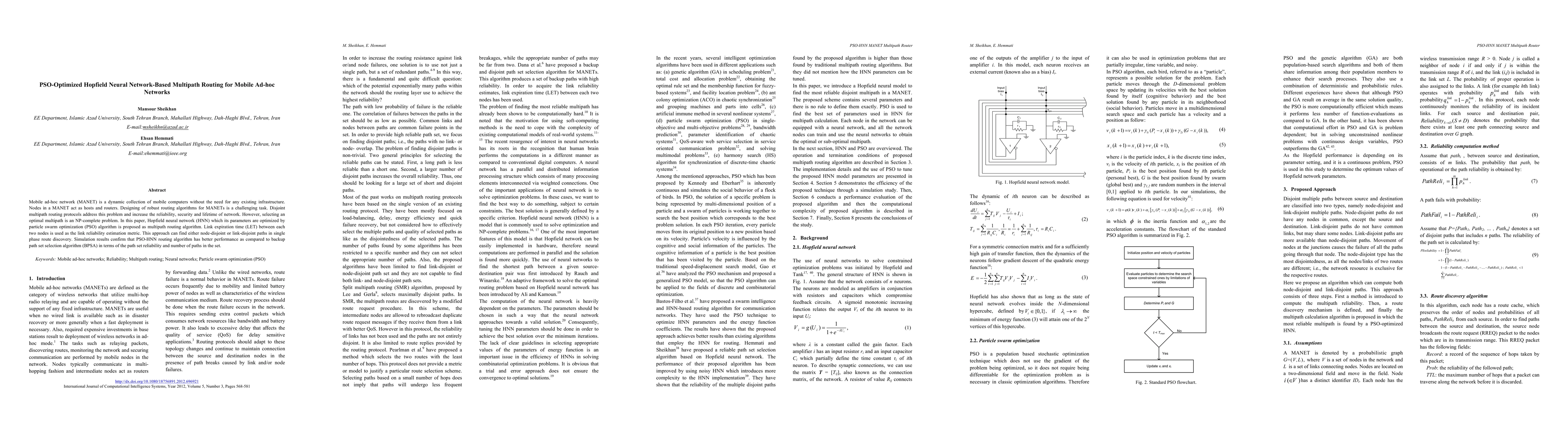 This paper proposes a PSO-optimized Hopfield neural network (HNN) for multipath routing in mobile ad-hoc networks (MANETs), using link expiration time for reliability estimation. Simulation results show improved performance over existing backup path set selection algorithms in terms of path set reliability and path count.