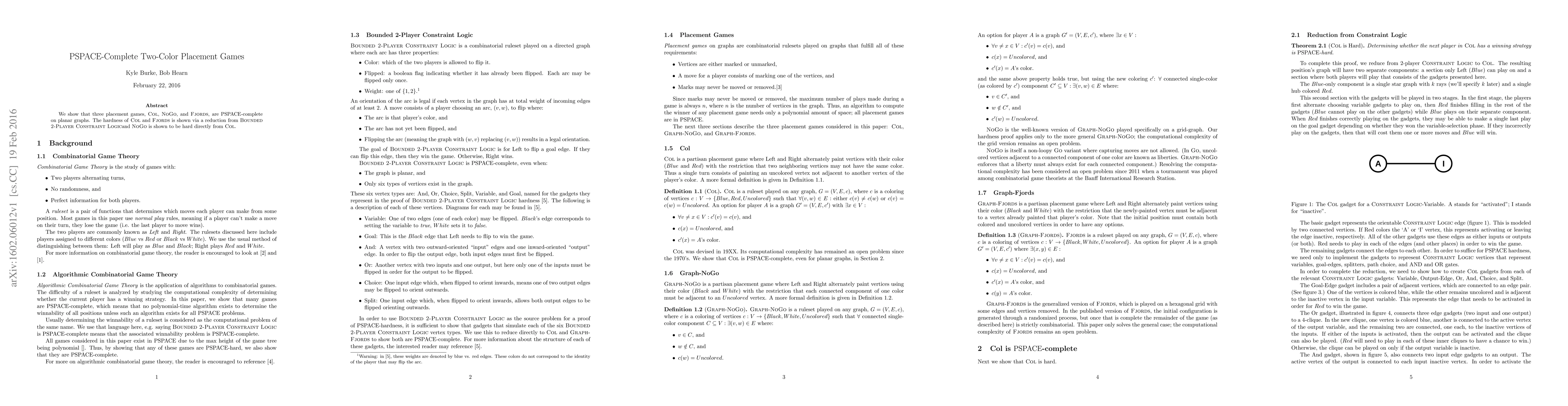 This paper demonstrates that three two-color placement games—Col, NoGo, and Fjords—are PSPACE-complete when played on planar graphs. The complexity of Col and Fjords is established through reductions from Bounded 2-Player Constraint Logic, while NoGo's complexity is derived directly from Col.