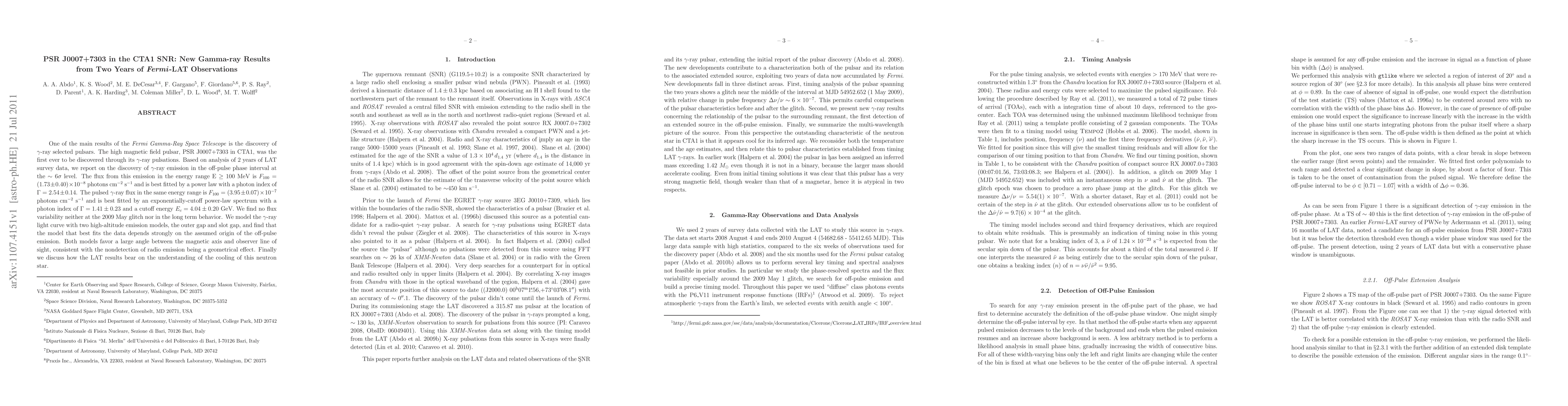 One of the main results of the Fermi Gamma-Ray Space Telescope is the discovery of {\gamma}-ray selected pulsars. The high magnetic field pulsar, PSR J0007+7303 in CTA1, was the first ever to be discovered through its {\gamma}-ray pulsations. Based on analysis of 2 years of LAT survey data, we report on the discovery of {\gamma}-ray emission in the off-pulse phase interval at the ~ 6{\sigma} level. The flux from this emission in the energy range E \geq 100 MeV is F_100 = (1.73\pm0.40)\times10^(-8) photons/cm^2/s and is best fitted by a power law with a photon index of {\Gamma} = 2.54\pm0.14. The pulsed {\gamma}-ray flux in the same energy range is F_100 = (3.95\pm0.07)\times10^(-7) photons/cm^2/s and is best fitted by an exponentially-cutoff power-law spectrum with a photon index of {\Gamma} = 1.41 \pm 0.23 and a cutoff energy E_c = 4.04 \pm 0.20 GeV. We find no flux variability neither at the 2009 May glitch nor in the long term behavior. We model the {\gamma}-ray light curve with two high-altitude emission models, the outer gap and slot gap, and find that the model that best fits the data depends strongly on the assumed origin of the off-pulse emission. Both models favor a large angle between the magnetic axis and observer line of sight, consistent with the nondetection of radio emission being a geometrical effect. Finally we discuss how the LAT results bear on the understanding of the cooling of this neutron star.