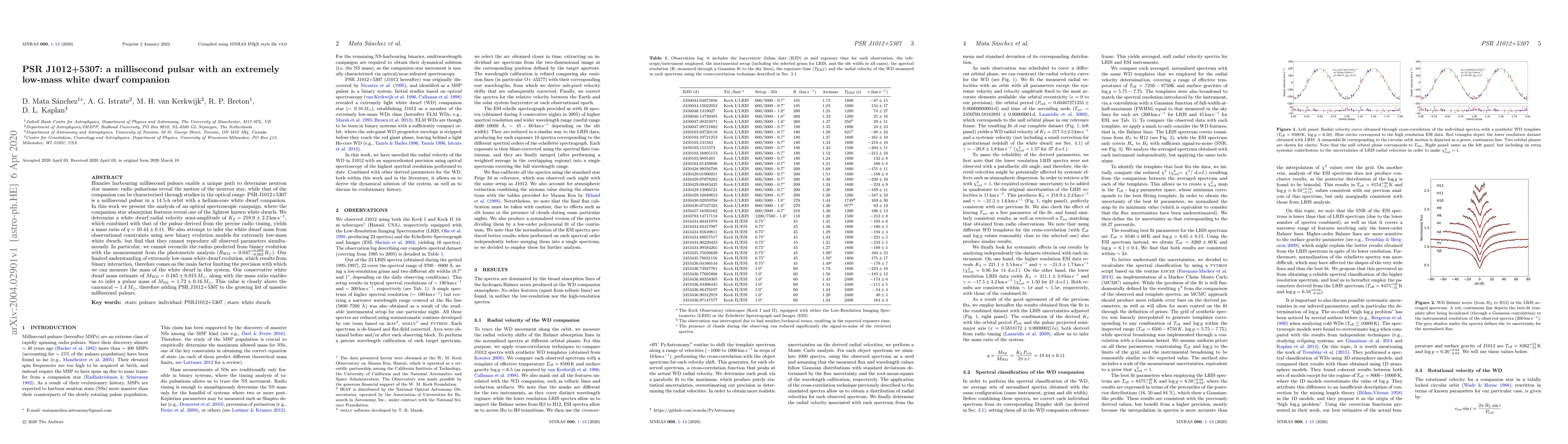 PSR J1012+5307 is a millisecond pulsar with an extremely low-mass helium-white dwarf companion, revealing a mass ratio of q=10.44±0.11. The white dwarf's mass estimate of M_WD = 0.165 ± 0.015 Msun suggests a pulsar mass of M_NS = 1.72 ± 0.16 Msun, indicating it is one of the most massive known millisecond pulsars.
