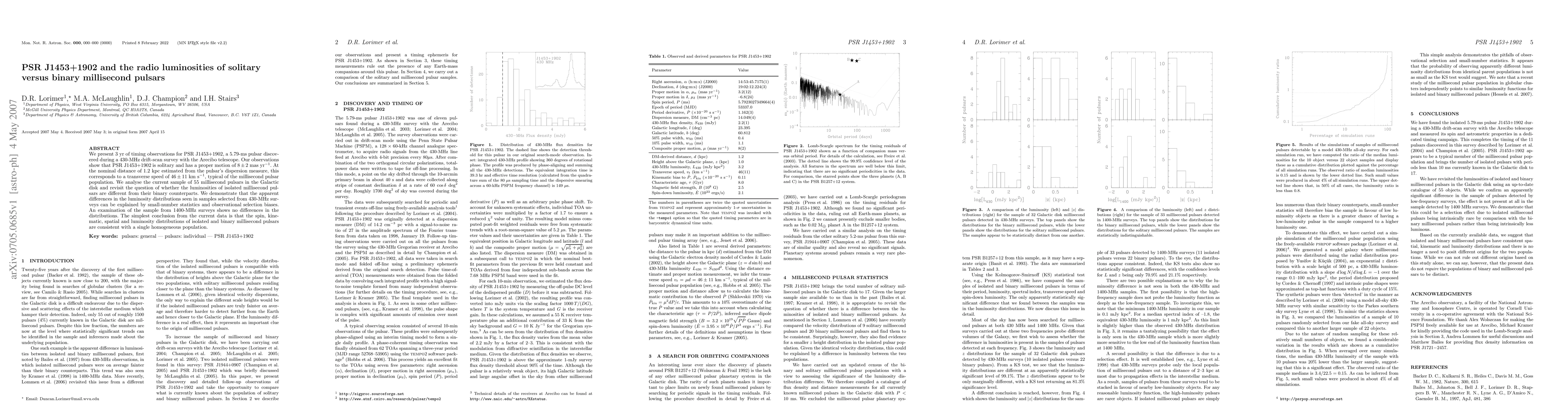 This study presents 3 years of observations for PSR J1453+1902, confirming it as a solitary, fast-moving millisecond pulsar. Analyzing 55 Galactic disk MSPs, researchers found no significant luminosity differences between isolated and binary MSPs, suggesting a single homogeneous population. The apparent discrepancies in previous 430-MHz survey samples were attributed to small-number statistics and observational biases.