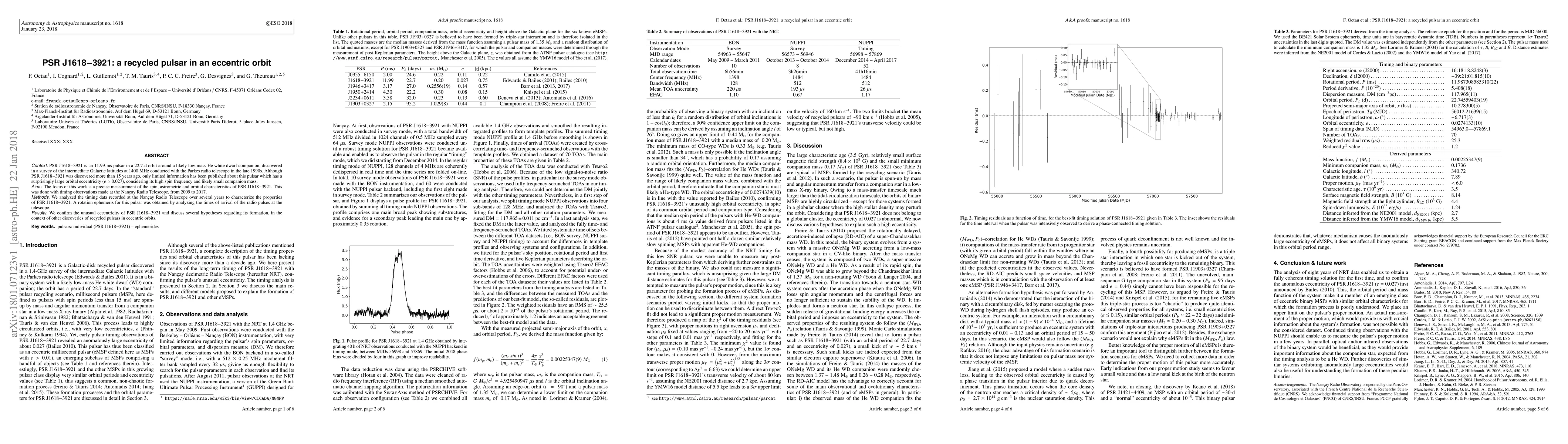 Astronomers studied PSR J1618-3921, a recycled pulsar with an unusual large orbital eccentricity, and found it has a spin period of 11.99 milliseconds in a 22.7-day orbit around a low-mass companion.