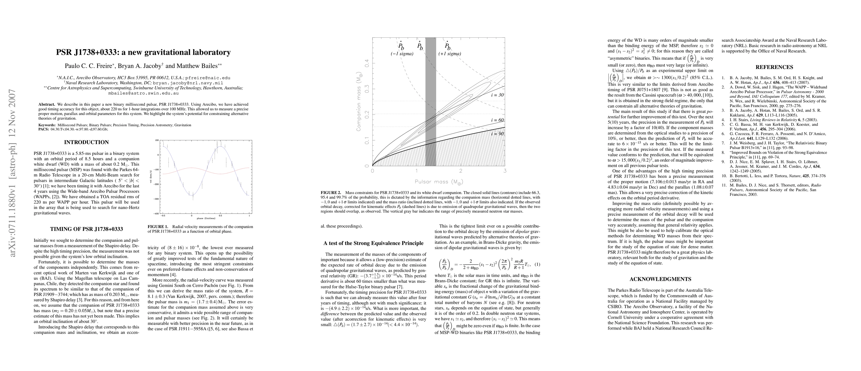 This paper introduces PSR J1738+0333, a new binary millisecond pulsar with high timing accuracy, enabling precise measurements of its proper motion, parallax, and orbital parameters. The system's detailed characteristics make it a valuable candidate for testing alternative theories of gravitation.