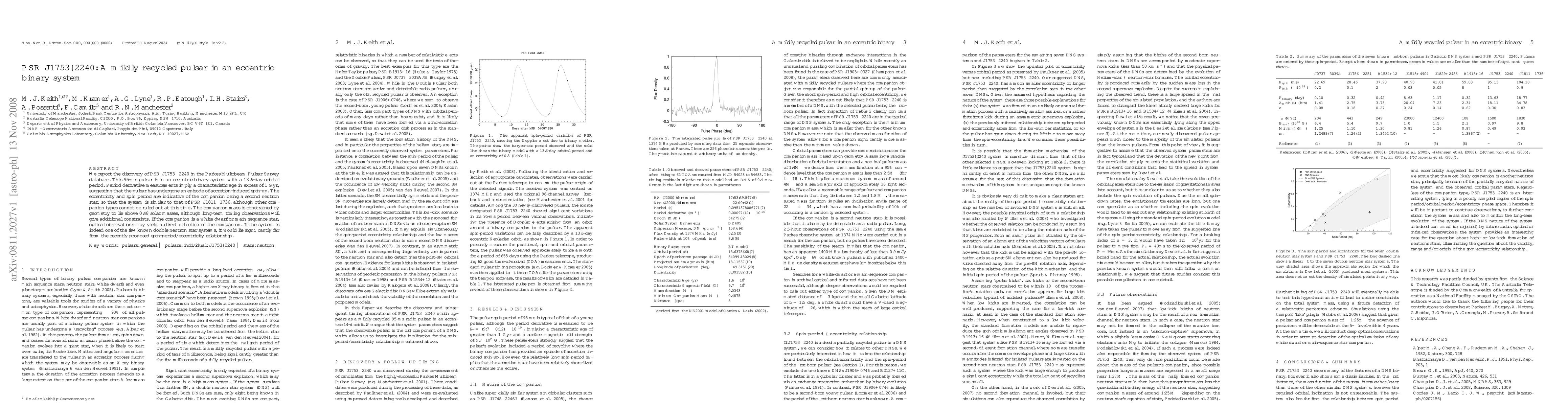 The paper reports the discovery of PSR J1753-2240, a 95-ms pulsar in an eccentric binary system with a 13.6-day orbit. Its characteristic age exceeds 1 Gyr, suggesting past accretion-induced spin-up. The companion is likely a second neutron star, though other possibilities exist. The companion's mass is constrained above 0.48 solar masses, and if it's a visible star or white dwarf, it could be directly observed. If confirmed as a double neutron star system, it would deviate from the proposed spin-period/eccentricity relationship.