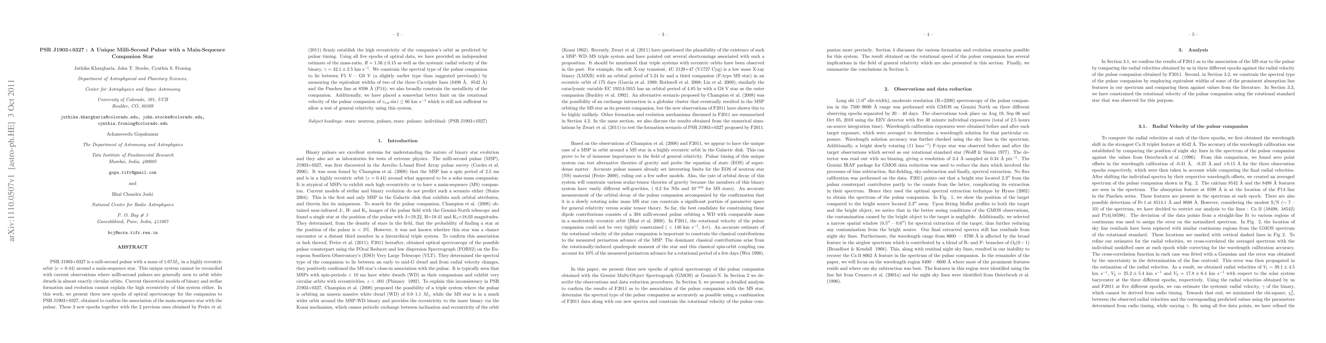 PSR J1903+0327 is a mili-second pulsar with a mass of 1.67 M_{\odot} in a highly eccentric orbit (e=0.44) around a main-sequence star. This unique system cannot be reconciled with current observations where milli-second pulsars are generally seen to orbit white dwarfs in almost exactly circular orbits. Current theoretical models of binary and stellar formation and evolution cannot explain the high eccentricity of this system either. In this work, we present three new epochs of optical spectroscopy for the companion to PSR J1903+0327, obtained to confirm the association of the main-sequence star with the pulsar. These 3 new epochs together with the 2 previous ones obtained by Freire et al. (2011) firmly establish the high eccentricity of the companion's orbit as predicted by pulsar timing. Using all five epochs of optical data, we have provided an independent estimate of the mass-ratio, R=1.56\pm0.15 as well as the systemic radial velocity of the binary, \gamma= 42.1\pm2.5 km/s. We constrain the spectral type of the pulsar companion to lie between F5 V -- G0 V (a slightly earlier type than suggested previously) by measuring the equivalent widths of two of the three Ca-triplet lines (8498 \AA, 8542 \AA) and the Paschen line at 8598 \AA (P14); we also broadly constrain the metallicity of the companion. Additionally, we have placed a somewhat better limit on the rotational velocity of the pulsar companion of v_{rot}\sin{i} \leq 66 km/s which is still not sufficient to allow a test of general relativity using this system.
