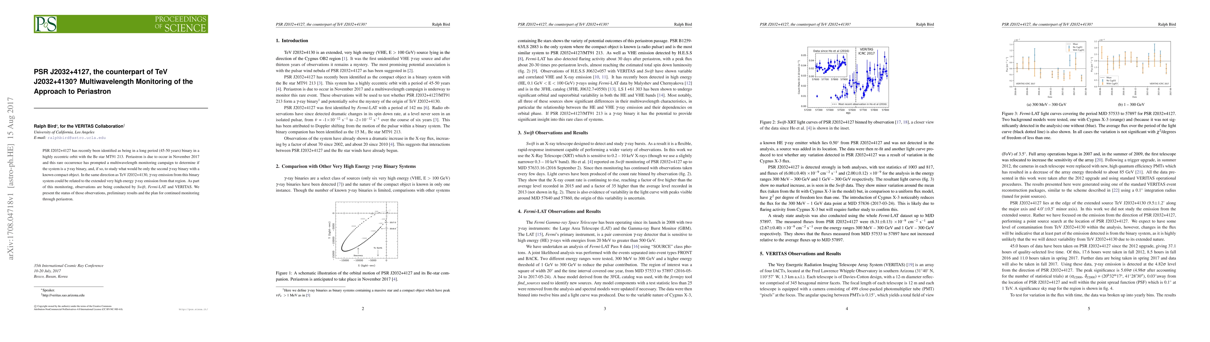 PSR J2032+4127 has recently been identified as being in a long period (45-50 years) binary in a highly eccentric orbit with the Be star MT91 213. Periastron is due to occur in November 2017 and this rare occurrence has prompted a multiwavelength monitoring campaign to determine if the system is a gamma-ray binary, and, if so, to study what would be only the second gamma-ray binary with a known compact object. In the same direction as TeV J2032+4130, gamma-ray emission from this binary system could be related to the extended very high energy gamma-ray emission from that region. As part of this monitoring, observations are being conducted by Swift, Fermi-LAT and VERITAS. We present the status of those observations, preliminary results and the plan for continued monitoring through periastron.