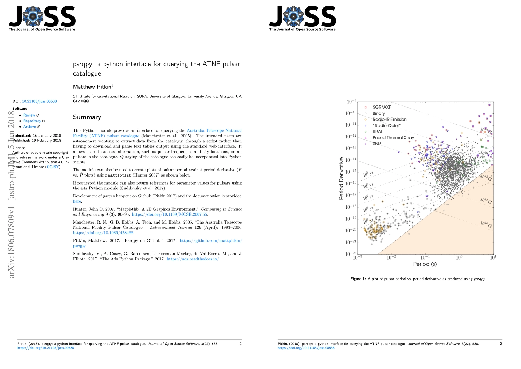 Summary: psrqpy is a Python module for querying the ATNF pulsar catalogue, enabling astronomers to extract data directly through scripts without manual text parsing. It provides access to pulsar frequencies and sky locations for all catalogue entries.