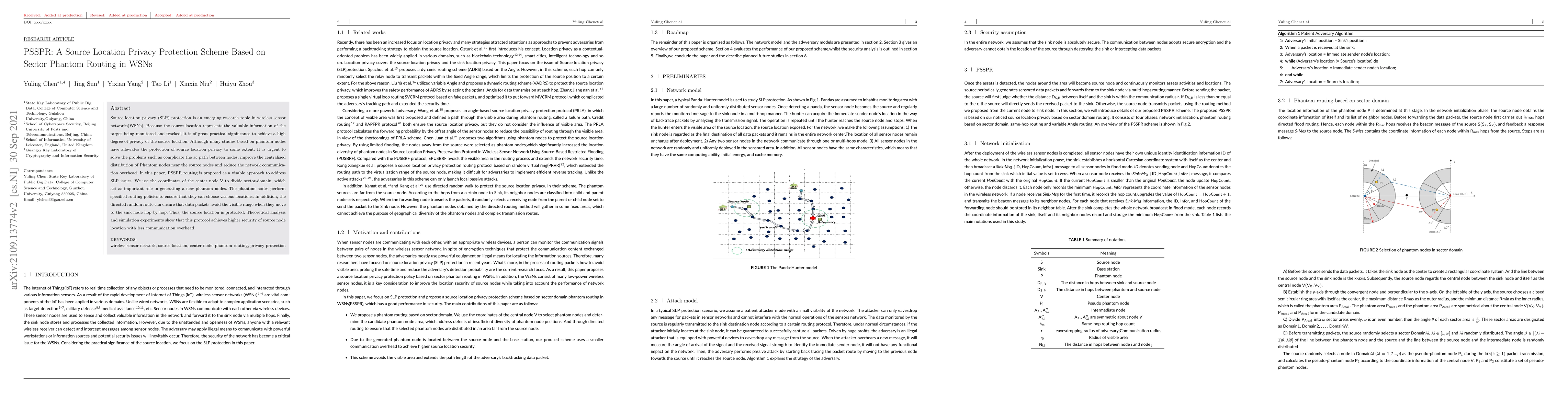 This paper proposes PSSPR, a source location privacy protection scheme using sector phantom routing in WSNs. It employs sector-based division and phantom nodes to ensure data packets avoid the source's visible range, achieving higher security with reduced communication overhead.