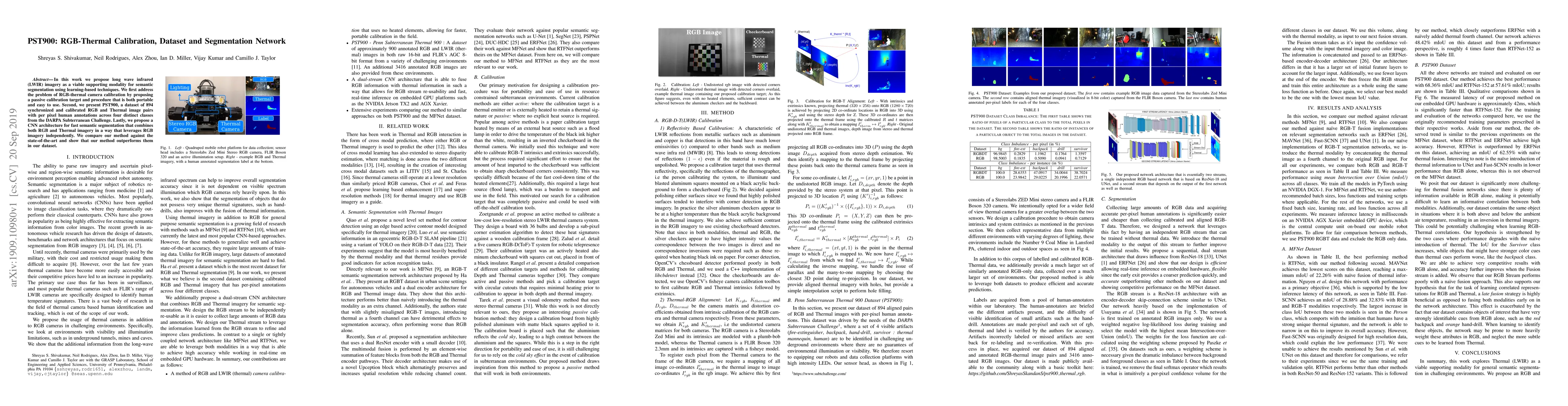 In this work we propose long wave infrared (LWIR) imagery as a viable supporting modality for semantic segmentation using learning-based techniques. We first address the problem of RGB-thermal camera calibration by proposing a passive calibration target and procedure that is both portable and easy to use. Second, we present PST900, a dataset of 894 synchronized and calibrated RGB and Thermal image pairs with per pixel human annotations across four distinct classes from the DARPA Subterranean Challenge. Lastly, we propose a CNN architecture for fast semantic segmentation that combines both RGB and Thermal imagery in a way that leverages RGB imagery independently. We compare our method against the state-of-the-art and show that our method outperforms them in our dataset.