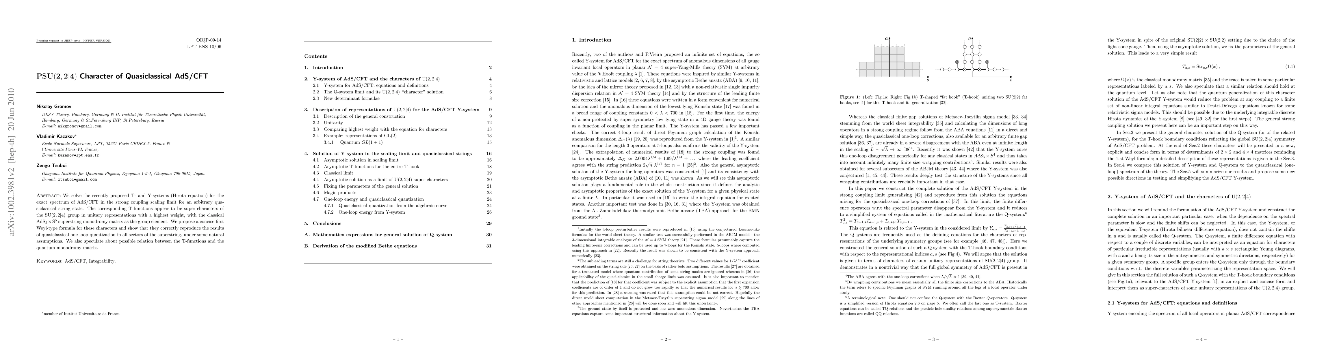 We solve the recently proposed T- and Y-systems (Hirota equation) for the exact spectrum of AdS/CFT in the strong coupling scaling limit for an arbitrary quasiclassical string state. The corresponding T-functions appear to be super-characters of the SU(2,2|4) group in unitary representations with a highest weight, with the classical AdS5xS5 superstring monodromy matrix as the group element. We propose a concise first Weyl-type formula for these characters and show that they correctly reproduce the results of quasiclassical one-loop quantization in all sectors of the superstring, under some natural assumptions. We also speculate about possible relation between the T-functions and the quantum monodromy matrix.