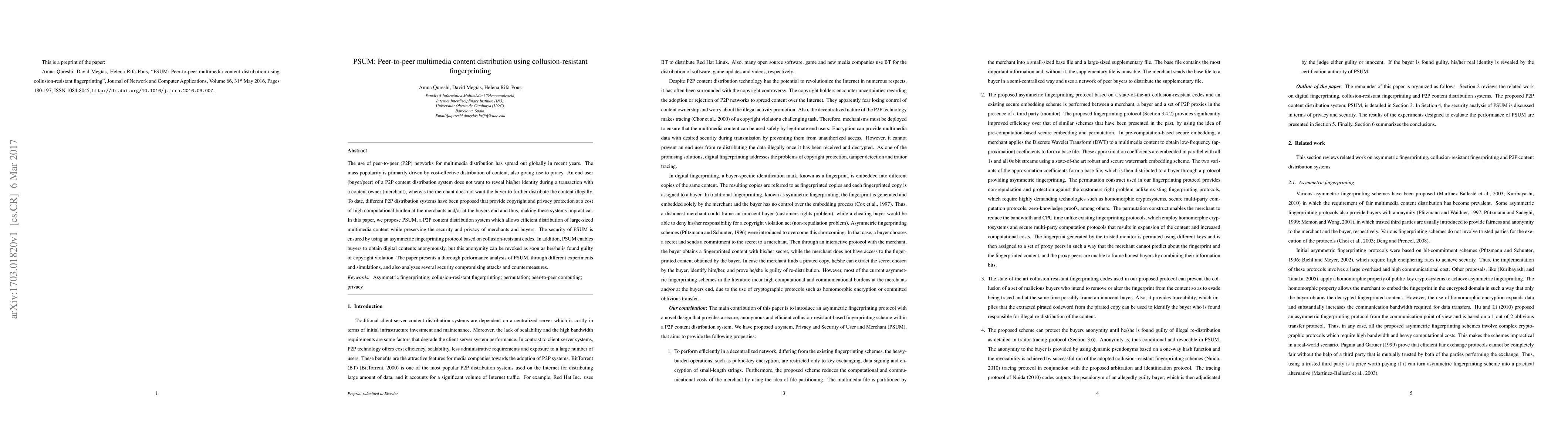 PSUM is a peer-to-peer multimedia content distribution system that employs collusion-resistant fingerprinting to ensure secure and private transactions, balancing the need for anonymity with the ability to revoke it in cases of copyright infringement. The system's performance and security are rigorously analyzed through experiments and simulations.