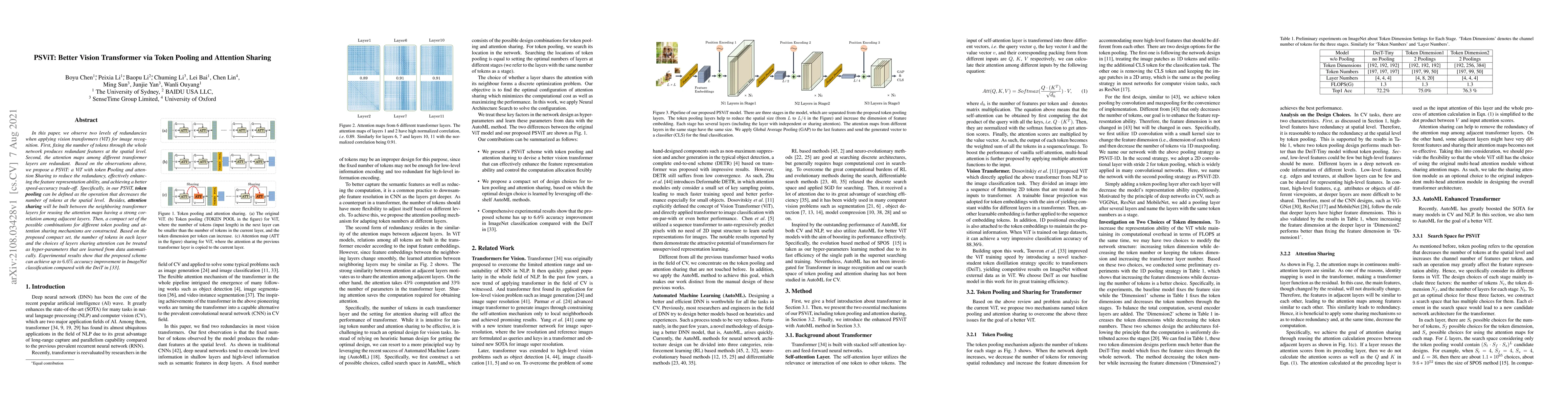The paper proposes PSViT, a Vision Transformer (ViT) variant that reduces redundancy through token pooling and attention sharing. It constructs a compact set of possible combinations for token pooling and attention sharing mechanisms, treating the number of tokens and layers sharing attention as hyperparameters learned from data.