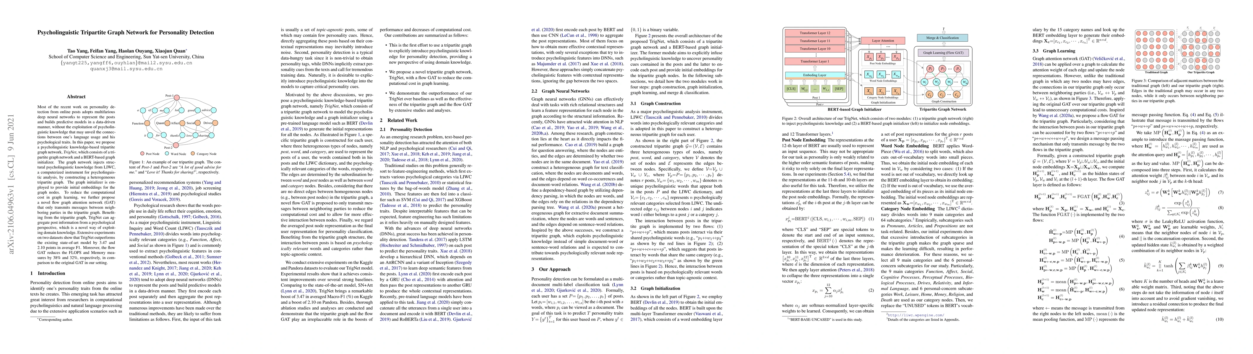 This paper introduces TrigNet, a psycholinguistic tripartite graph network for personality detection, which leverages psycholinguistic knowledge from LIWC to construct a heterogeneous graph. The proposed flow graph attention network (GAT) reduces computational costs while maintaining performance, achieving better results than existing models and showing significant reductions in FLOPS and memory usage.