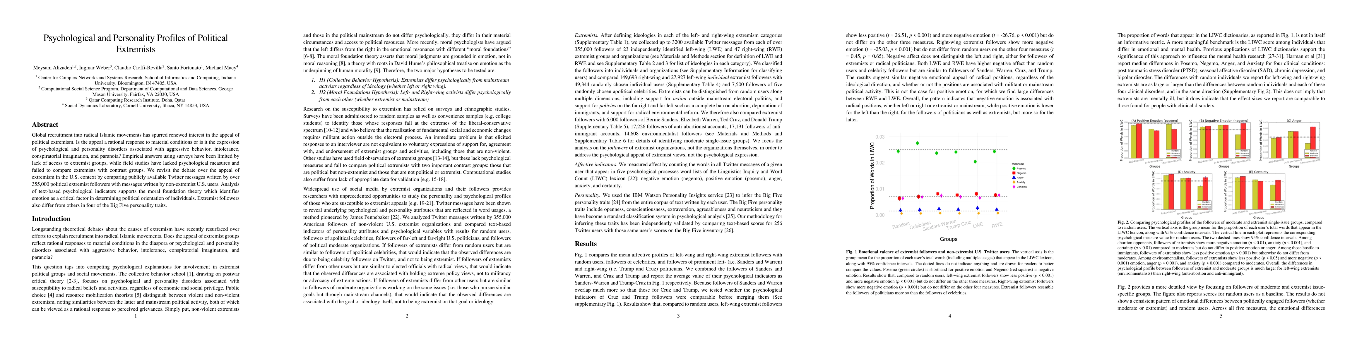 This study compares Twitter messages from over 355,000 political extremist followers and non-extremist U.S. users to identify psychological and personality differences, finding support for moral foundation theory and revealing extremist followers' distinct personality traits.