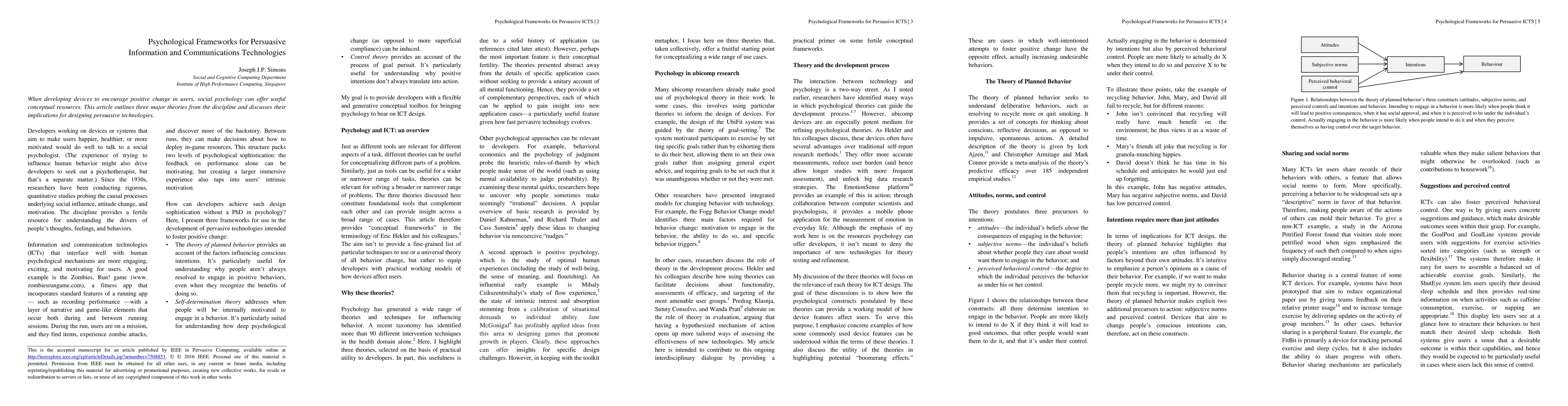 This paper explores the application of social psychology theories to design persuasive information and communication technologies. It outlines three major psychological frameworks and discusses their implications for encouraging positive user behavior changes.