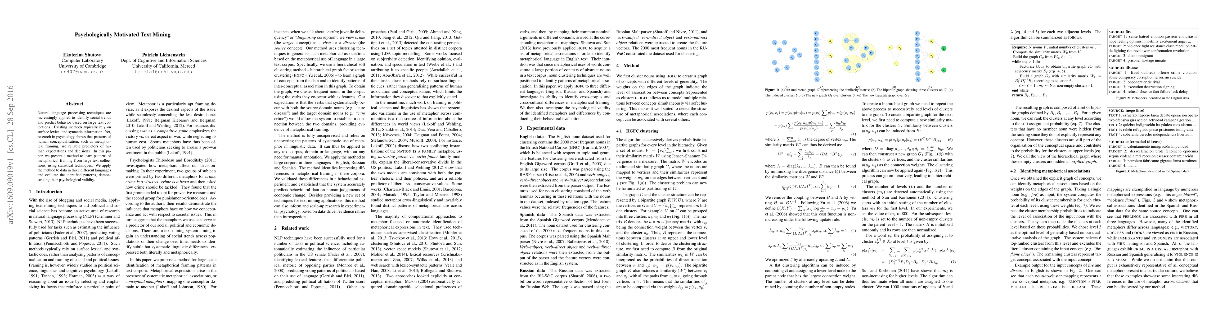 Natural language processing techniques are increasingly applied to identify social trends and predict behavior based on large text collections. Existing methods typically rely on surface lexical and syntactic information. Yet, research in psychology shows that patterns of human conceptualisation, such as metaphorical framing, are reliable predictors of human expectations and decisions. In this paper, we present a method to learn patterns of metaphorical framing from large text collections, using statistical techniques. We apply the method to data in three different languages and evaluate the identified patterns, demonstrating their psychological validity.