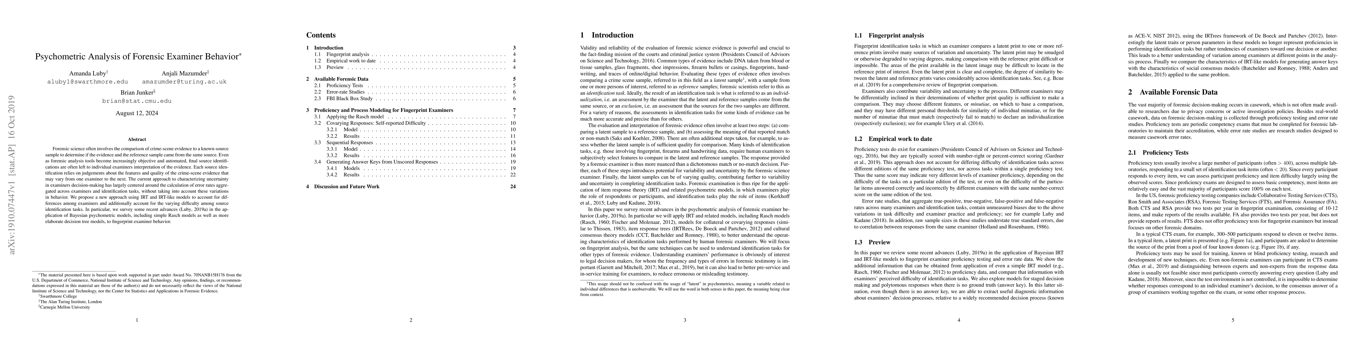 This paper proposes a new psychometric approach using Item Response Theory (IRT) and Bayesian models to analyze and account for individual variations in forensic examiners' interpretation of crime-scene evidence, addressing the limitations of traditional error-rate calculations. It highlights recent advances in applying these models to fingerprint examiner behavior.