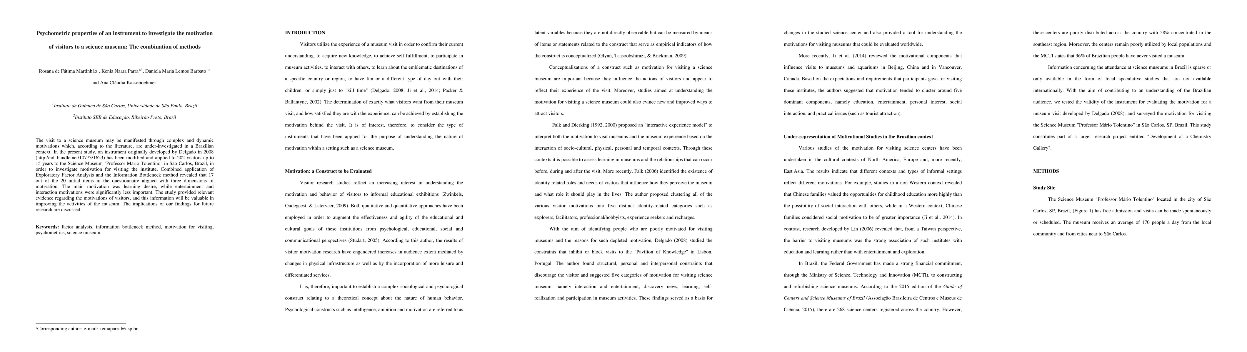 This study modified an existing instrument to explore the motivations of visitors to a Brazilian science museum, applying combined Exploratory Factor Analysis and the Information Bottleneck method. The results identified three main motivation dimensions, with a strong emphasis on learning desire, suggesting valuable insights for enhancing museum activities.