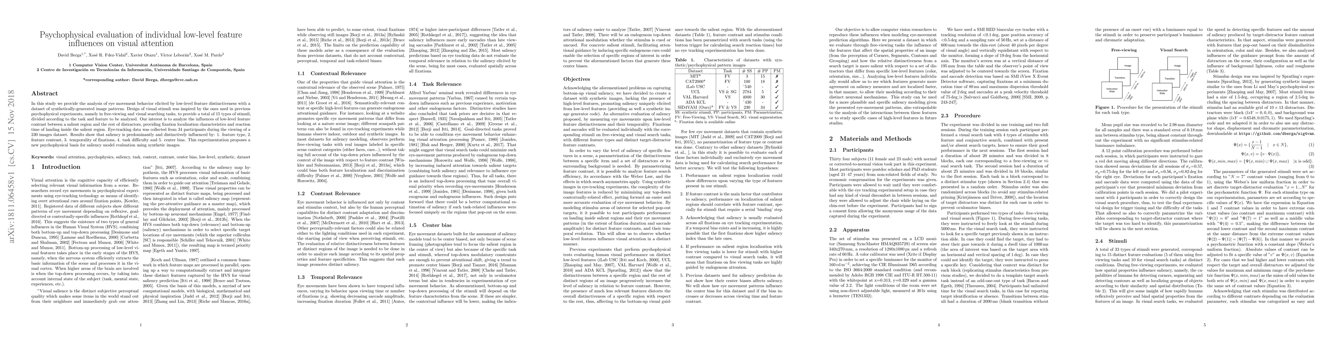 In this study we provide the analysis of eye movement behavior elicited by low-level feature distinctiveness with a dataset of synthetically-generated image patterns. Design of visual stimuli was inspired by the ones used in previous psychophysical experiments, namely in free-viewing and visual searching tasks, to provide a total of 15 types of stimuli, divided according to the task and feature to be analyzed. Our interest is to analyze the influences of low-level feature contrast between a salient region and the rest of distractors, providing fixation localization characteristics and reaction time of landing inside the salient region. Eye-tracking data was collected from 34 participants during the viewing of a 230 images dataset. Results show that saliency is predominantly and distinctively influenced by: 1. feature type, 2. feature contrast, 3. temporality of fixations, 4. task difficulty and 5. center bias. This experimentation proposes a new psychophysical basis for saliency model evaluation using synthetic images.